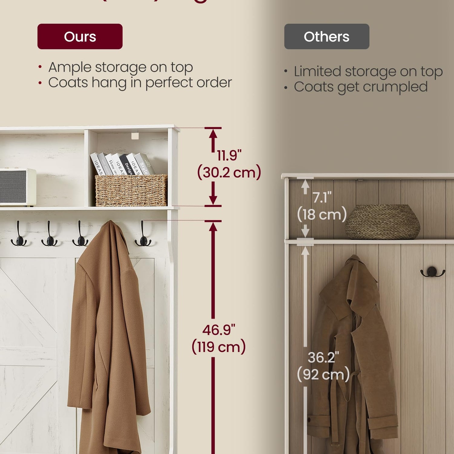 • [Farmhouse Style] Enhance your entryway with this wonderful coat rack and shoe bench! The rustic white hall tree adds a touch of farmhouse charm into your home, while providing ample storage space