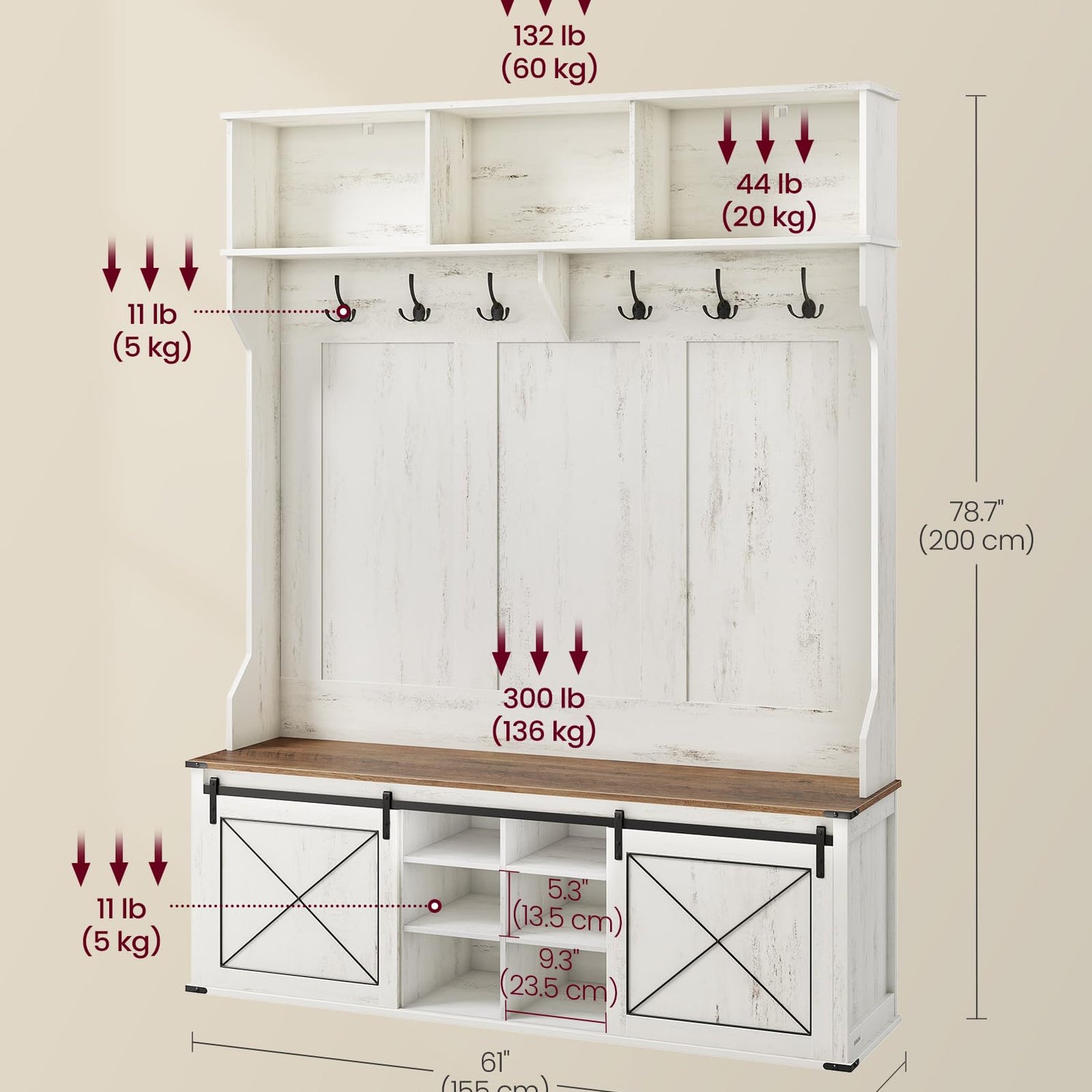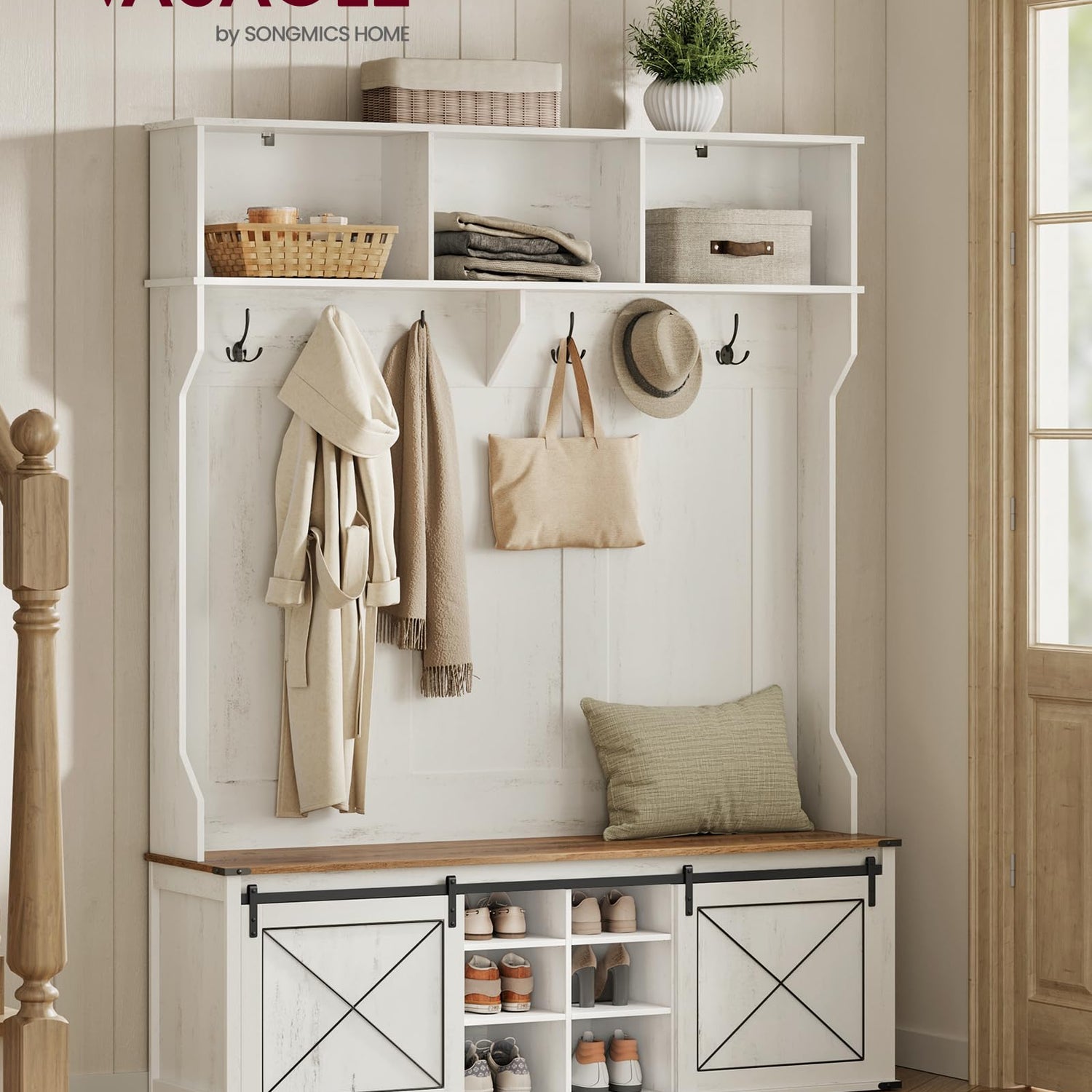 VASAGLE Hall Tree with Bench and Shoe Storage, Coat Rack with Shoe Bench, Entryway Furniture, 6 Tri-Hooks, Sliding Door, Farmhouse Style, Space Saving, Rustic White and Honey Brown UHSR443W01