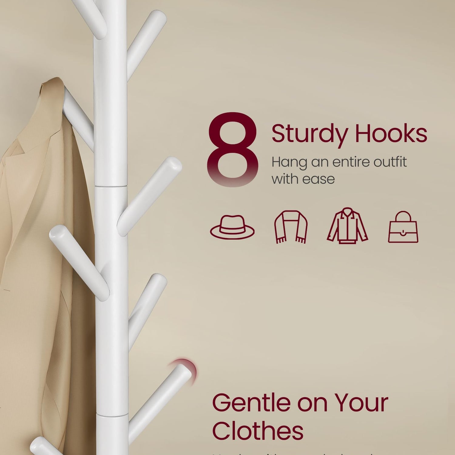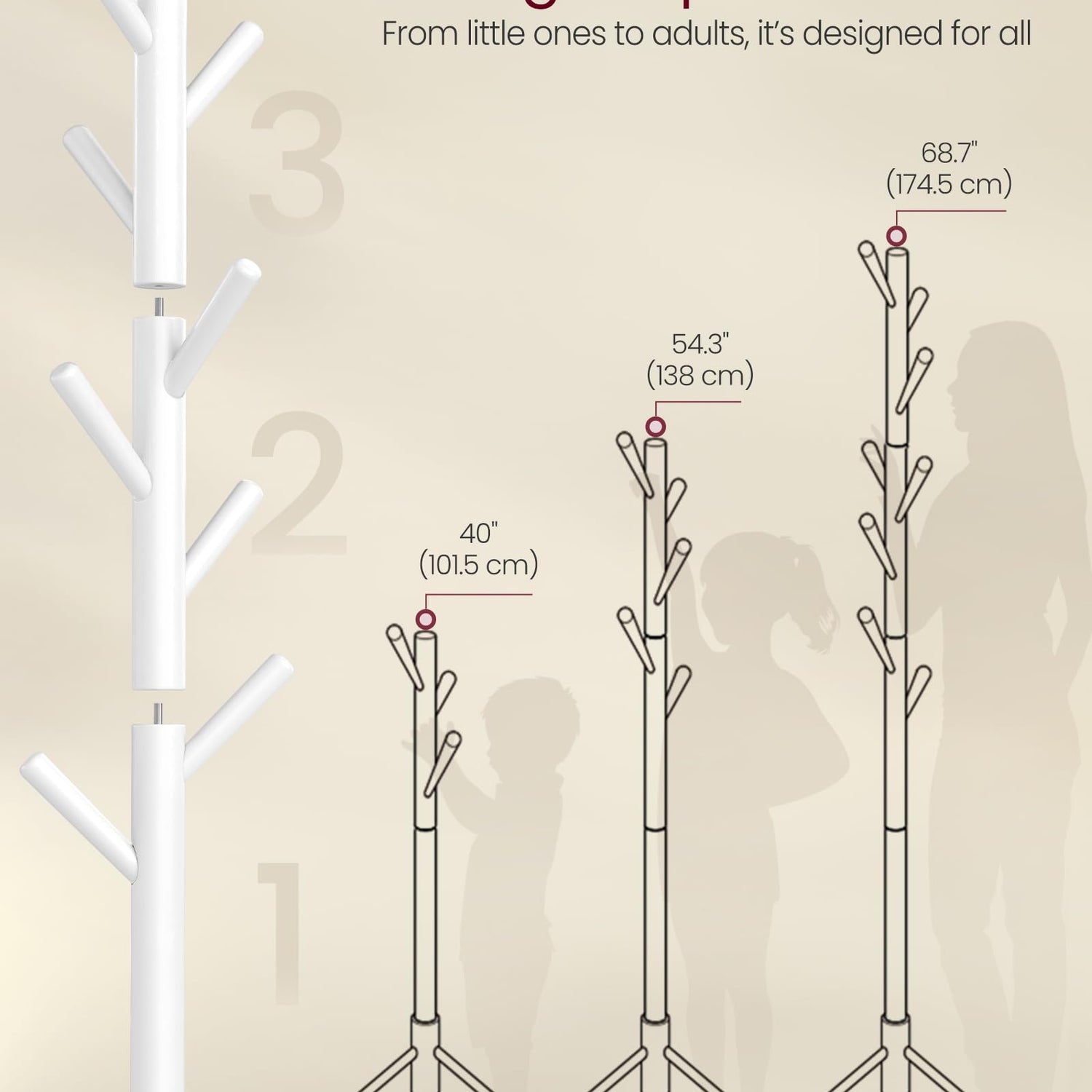 VASAGLE Solid Wood Coat Rack, Free Standing Tree-Shaped Coat Rack with 8 Hooks, 3 Height Options, for Clothes, Hats, Bags, Living Room, Bedroom, Home Office, White URCR04WT