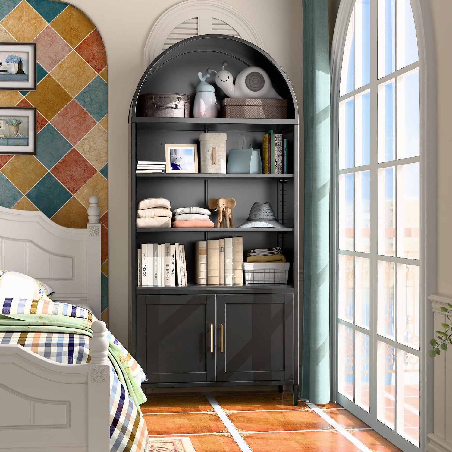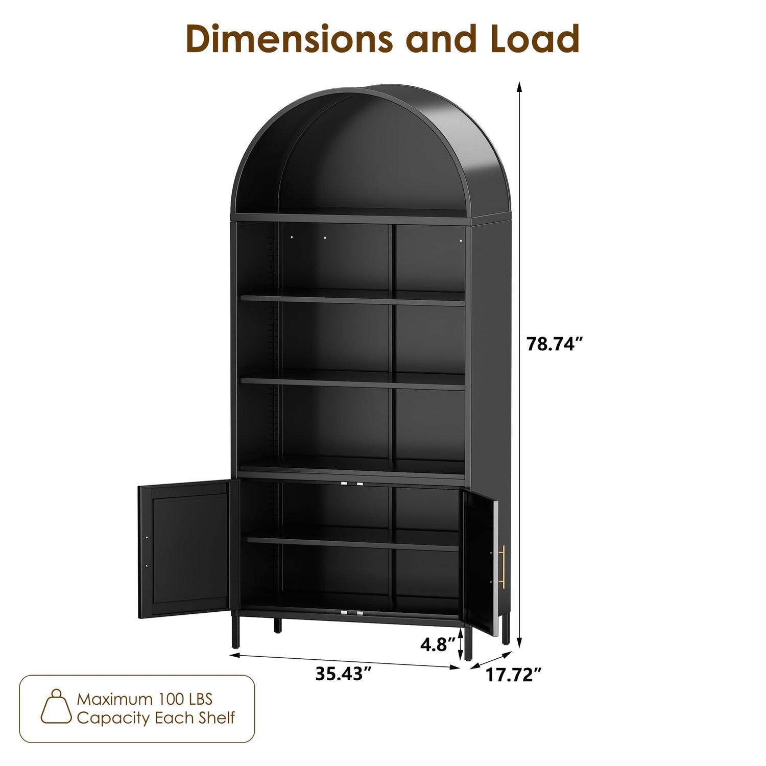 VEXPOR 79 in Tall Metal Arched Bookcase, 6-Tier Arched Bookcase with Doors, Modern Farmhouse Bookshelf with 3 Adjustable Shelves, Pantry Display Cabinet for Living Room, Black, Assembly Required