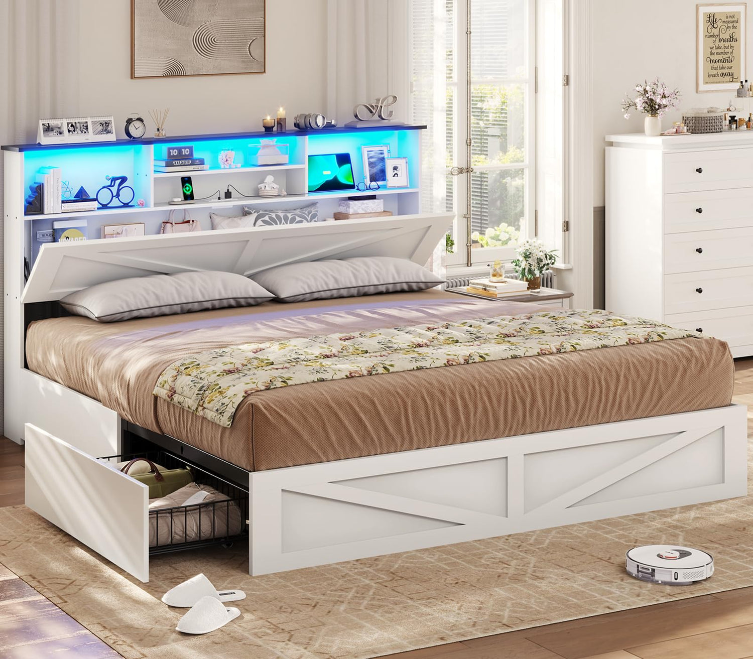 - 【Customized LED Lights】The farmhouse white king bed frame with headboard and storage is equipped with a light strip that can change multiple colors and modes. The LED lights boast over 60000 colors, 29 dynamic modes, brightness&speed adjustable, schedule on/off, dual control by remote or phone APP to customize your favorite style. Plus, the lights also sync with music and make lights dance, which can create a relaxing and romantic atmosphere in the room.