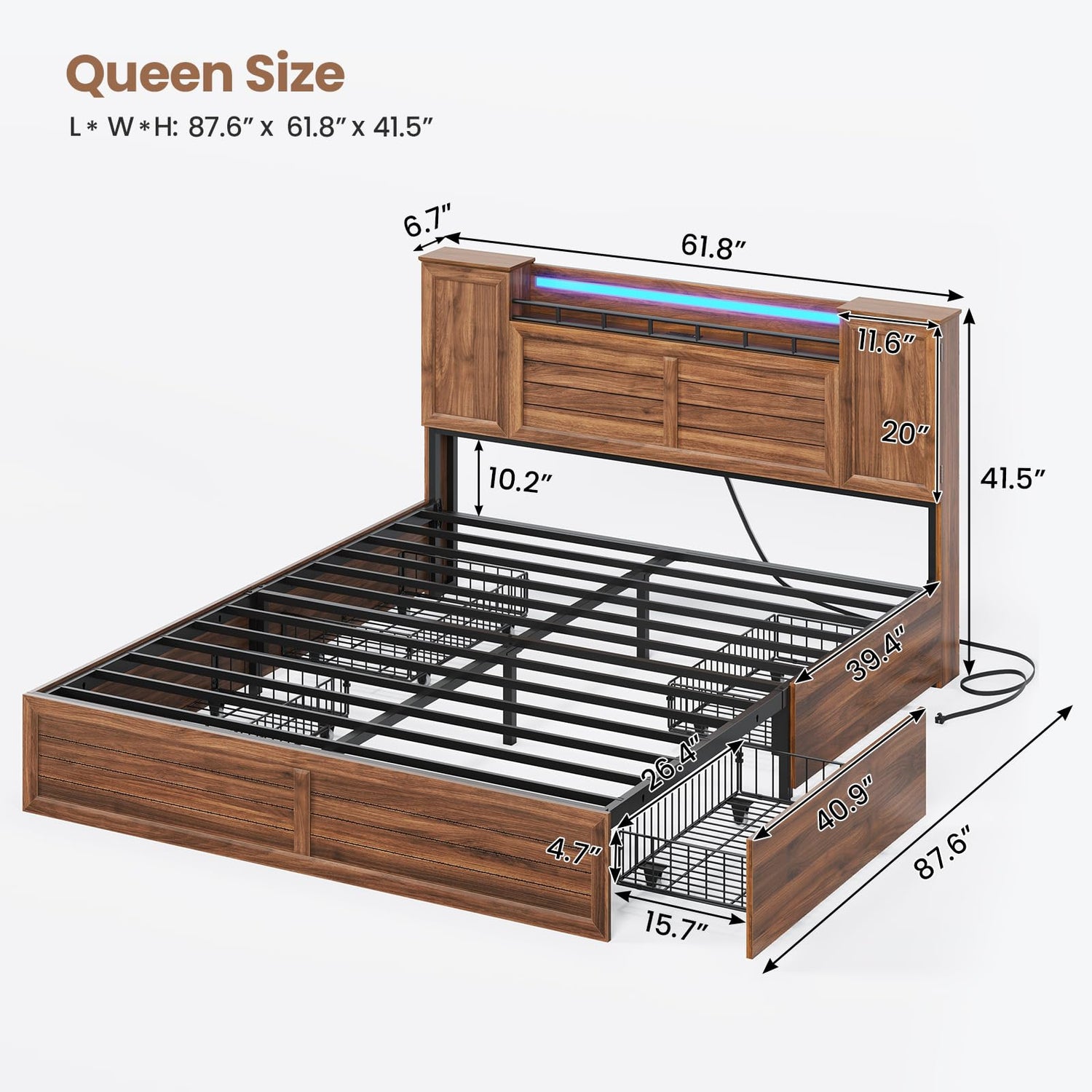 - 【Utility Storage Headboard】Unlock unparalleled organization with smartly divided compartments designed for every need. The queen size bed frames with headboard features a hidden storage zone, ideal for stashing nighttime essentials. While the dual side cabinets offer adjustable shelving system, you can adjust the height of the interior rack to accommodate tall items or compact accessories. And the open shelf with metal bars can store often-used items within hand’s reach and prevent falling.