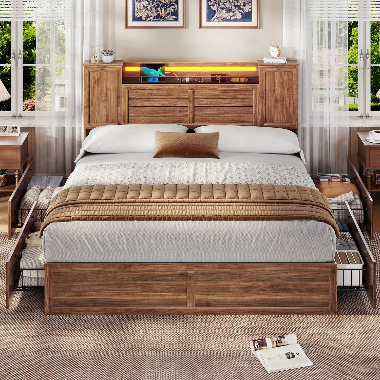 VIAGDO Farmhouse Queen Bed Frame with Headboard and Double Barn Door Storage Cabinets, Rustic Wooden Bed Frame Queen Size with Charging Station, 4 Drawers and LED Lights, No Box Spring Needed, Brown