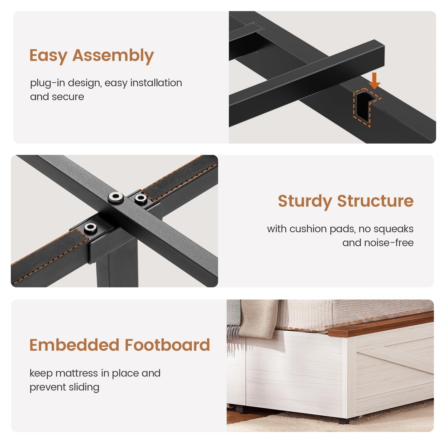 - 【Built to Last】The queen bed frame with drawers combines a strengthened metal frame with FSC-certified wood panels, supporting up to 1000 lbs with no box spring needed. Assembly is quick and tool-free thanks to the intuitive snap-on design, while noise-dampening felt strips on all metal contact points ensure a peaceful and scratch-free experience.