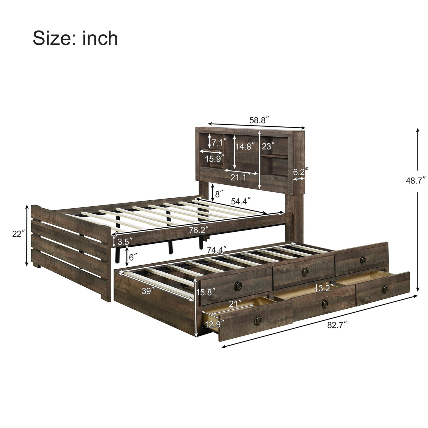 VilroCaz Rustic Brown Full Size Captain Bed with Bookcase Headboard, Drawers & Trundle