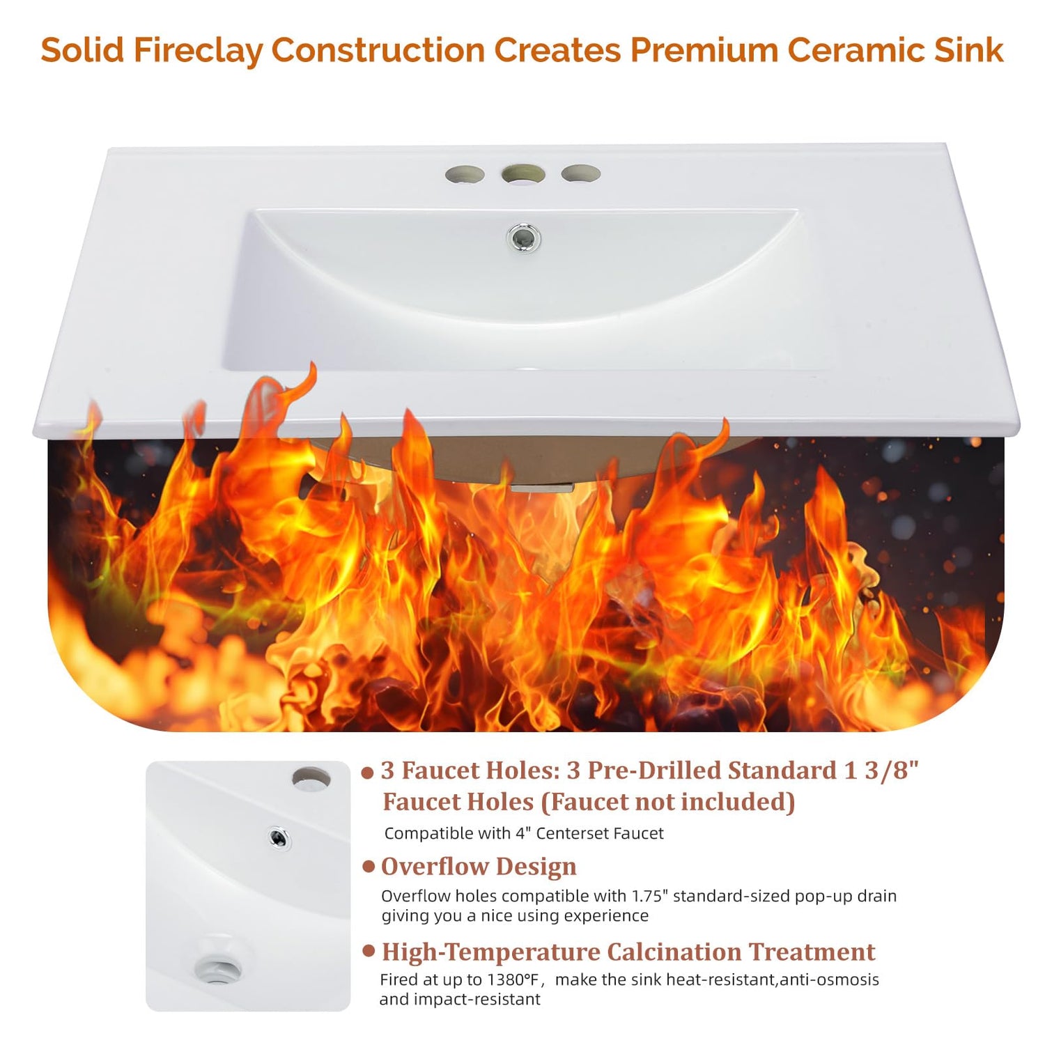 • 【Durable Ceramic Vanity Sink】: Scratch-resistant, easy-to-clean ceramic basin with 3 pre-drilled standard 1 3/8” faucet holes (faucet not included), compatible with 4" center faucets. Features a smooth white surface, offering long-lasting durability and a timeless, elegant appearance.