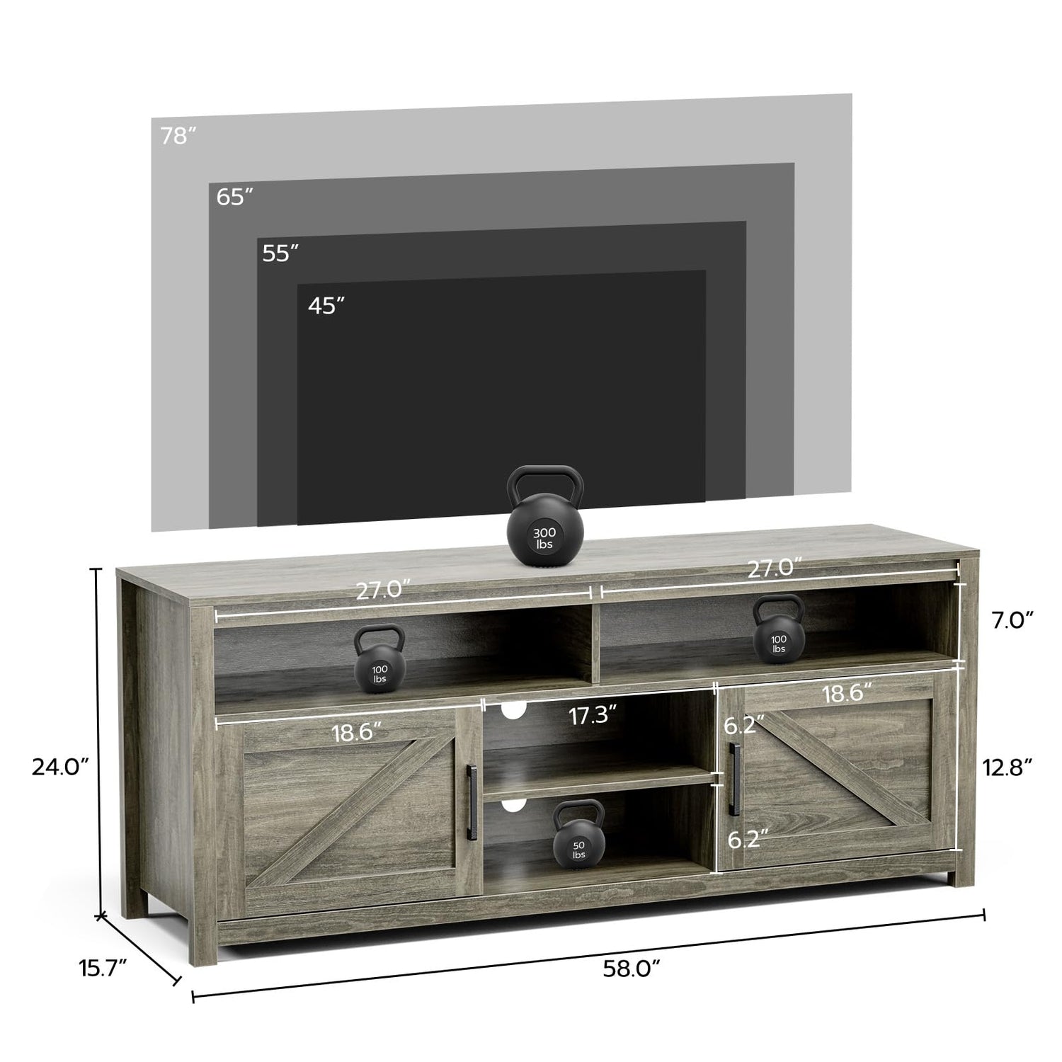 - Sturdy Structure: Made of high-quality P2, PB and MDF boards, this entertainment center is sturdy and durable to withstand long-term use. The desktop can bear 300 pounds, and each shelf can bear 50 pounds.The size: 58"L x 14"W x 20"H. It can accommodate TVs up to 65 inches.
