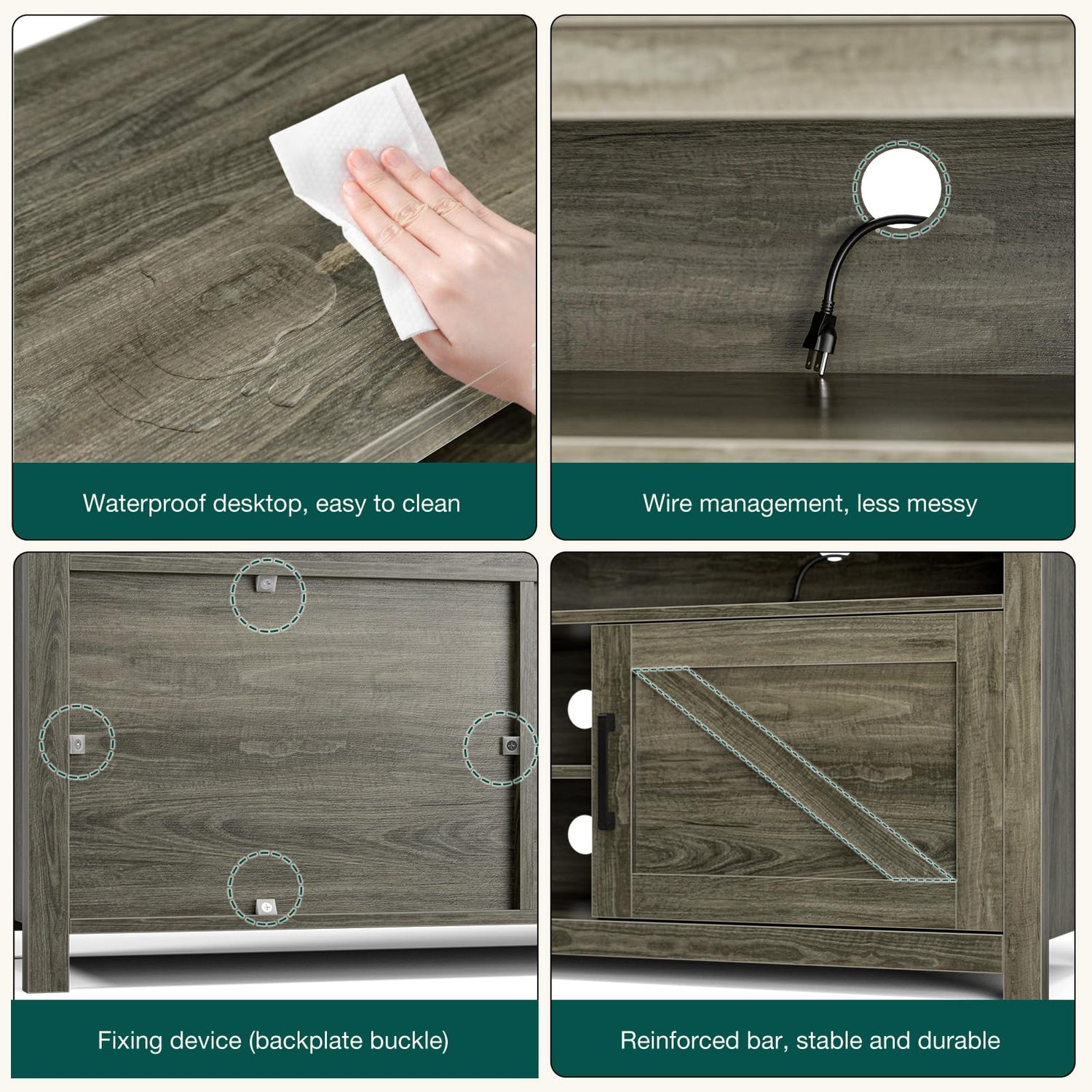 - TV Stand for 65 Inch TV: Waterproof desktop and power cord management hole: The TV desktop uses a waterproof coating, which can avoid getting the desktop wet. The TV stand is designed with drill holes, which can easily connect your electronic device power without cluttering it.