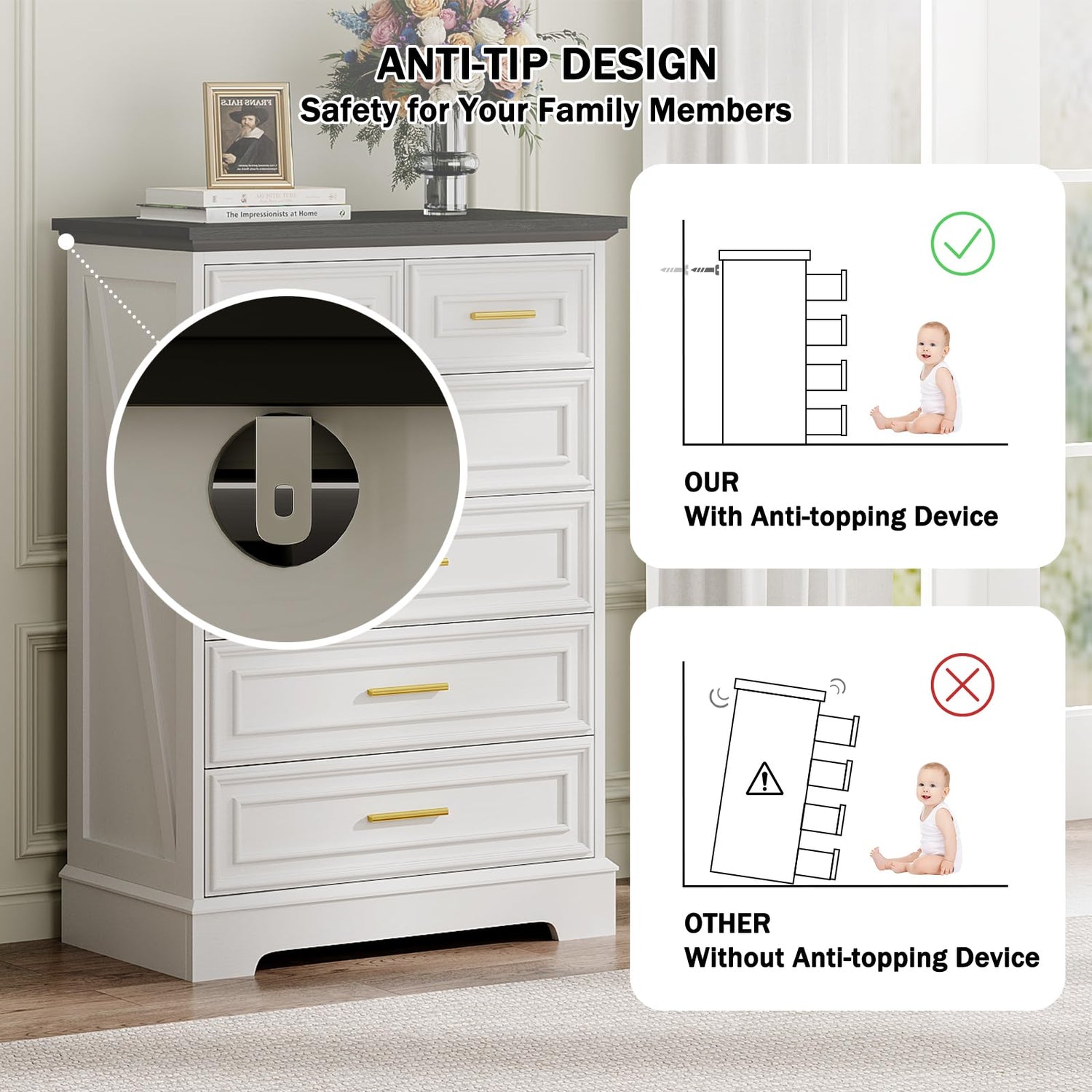 - Anti-Tipping & Elegant Modern Design: Our tall white dresser with anti-topping device, that makes it more stable when in use. Our 6 drawer wardrobe dressers feature a sleek, modern design with clean, crisp lines that will effortlessly enhance the décor of any room. Its sophisticated aesthetic not only adds a touch of elegance to your space, but also blends perfectly with a variety of interior styles.