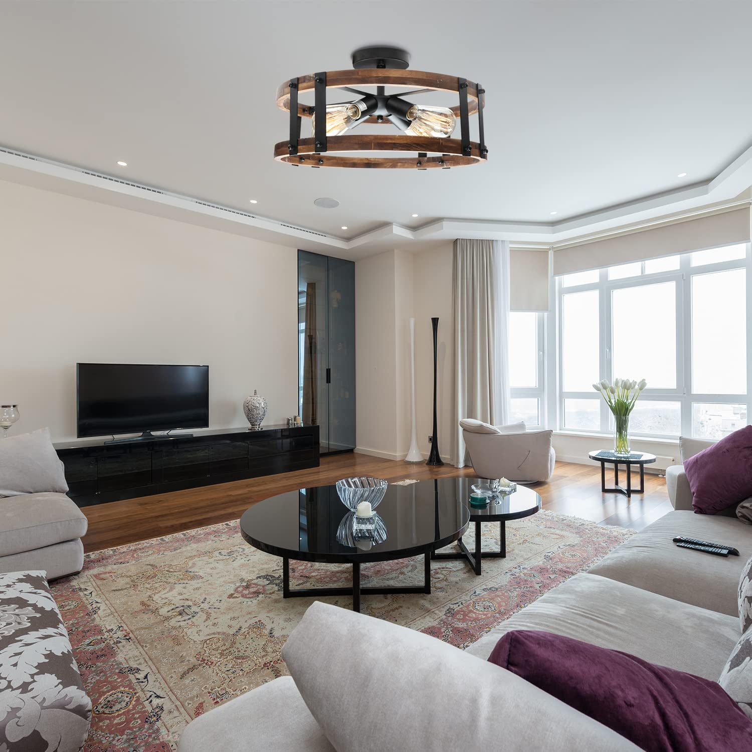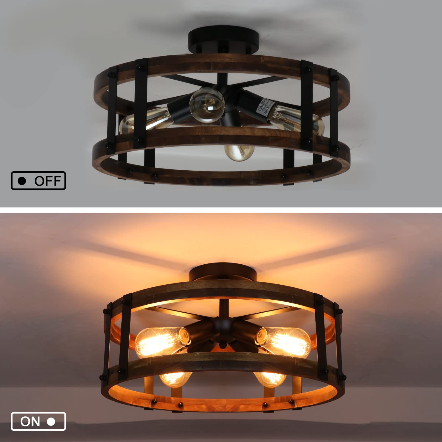 - [Industrial Meets Farmhouse]: Farm style ceiling light fixture is made of premium natural wood and industrial black metal. This farmhouse flush mount ceiling light is inspired by modern farmhouse accents and barn designs, offering distinct charm to your home, will add a retro aesthetic ambiance to your space.
