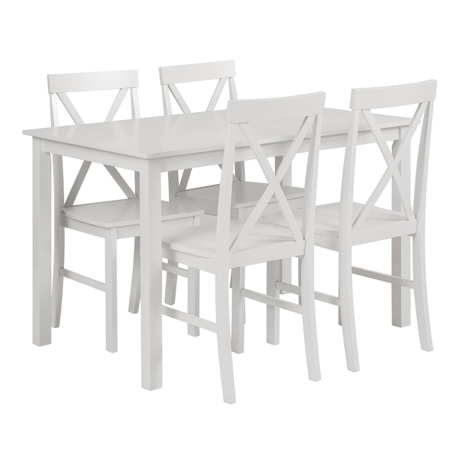 Details: Simple with just the right amount of farmhouse flair, this 5-piece dining set is the best solution for a small space living situation. Its cozy dimensions make it a great fit for apartment kitchens as well as craft corners, game rooms, or breakfast nooks. The four solid wood chairs feature a dynamic X-back design with a slight curve for extra comfort while the solid wood table is clean, sturdy and stylistically versatile.