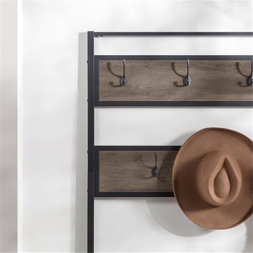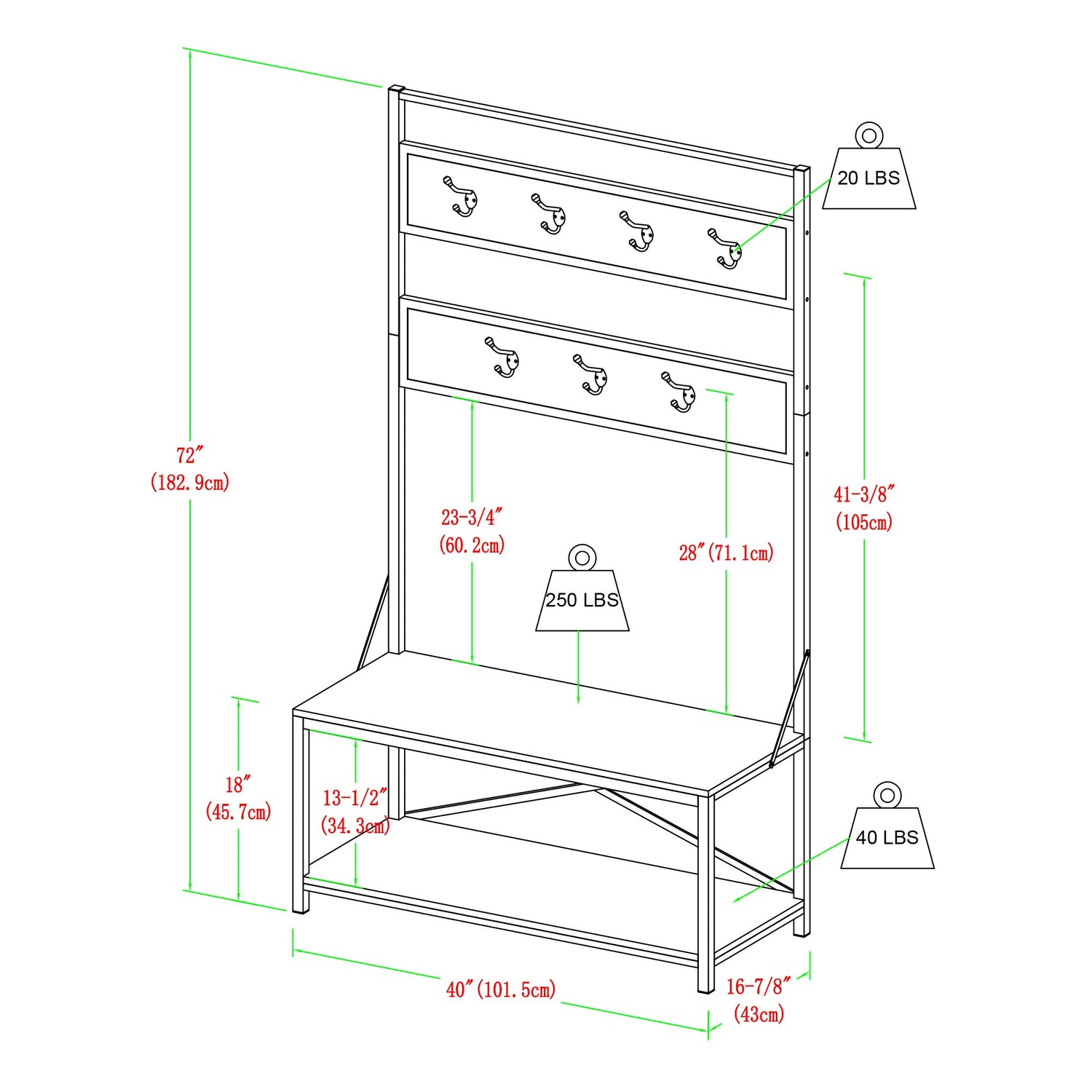 Details: Instantly tidy up and organize your hallway or entryway with our industrial hall tree. Perfect for storing your outdoor attire, from hats, coats, and shoes, to umbrellas and recreational gear as it provides a coat rack with seven hooks above and a bench with a shelf below. The high-grade manufactured wood, along with the powder coated metal frame, create an industrial-inspired design. You’ll easily have a place to keep your family’s jackets and backpacks off the floor, making this hall tree the perfect, practical storage and style piece in your home.