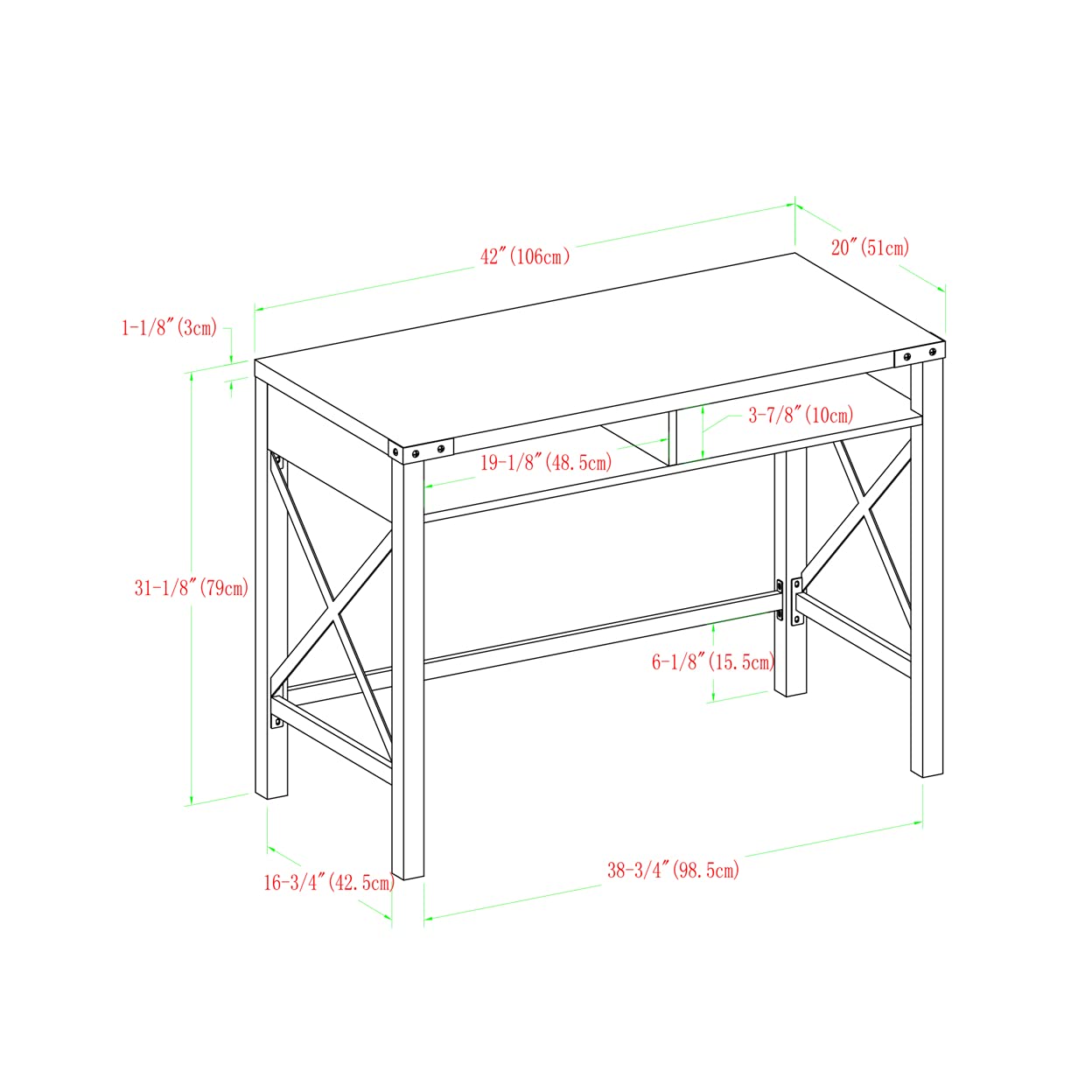 Details: Get more done with this farmhouse metal and wood desk. The simple tabletop this rustic writing desk offers is a great place to plan your schedule, finish homework, or work on a computer. It’s also a great hub to store electronics thanks to the two cubbies that both include cord management options, so you can easily charge your devices when they’re not in use. This country style desk features industrial accents with metal angle brackets, X’s on the sides, and a low wrap around bar for extra support.