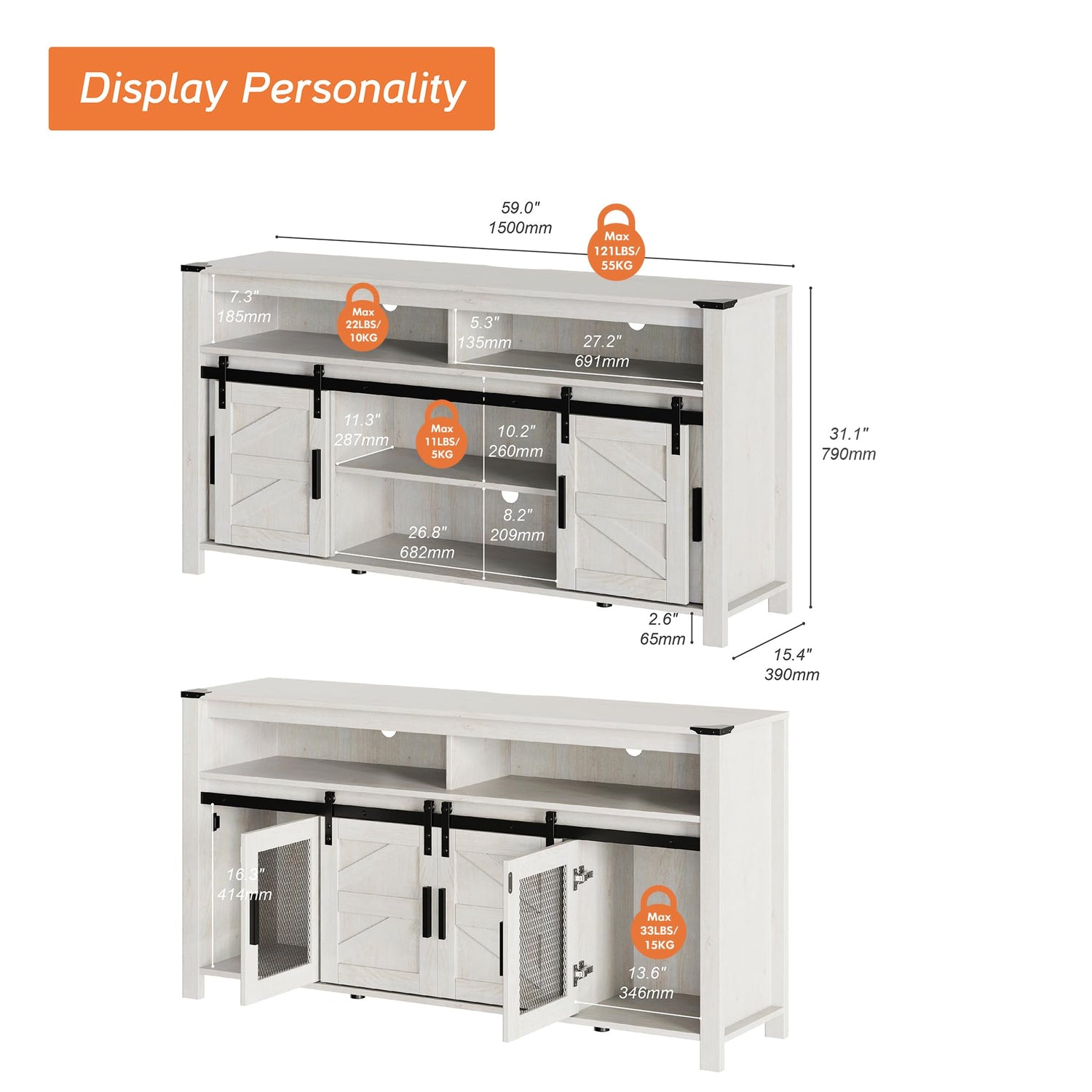 - Farmhouse TV Stand for 65 Inch TVs: This entertainment center measures 59" W x 15.35" D x 31" H, which supports 43/50/55/65 Inches flat screens easily. This wood tv console table design with a special barn-door pattern on the sliding doors and the visual mesh on the side doors, as well as the rustic metal corner decoration on two corners of the tabletop, brings the atmosphere of a Farmhouse&Rustic to your bedroom and living room.
