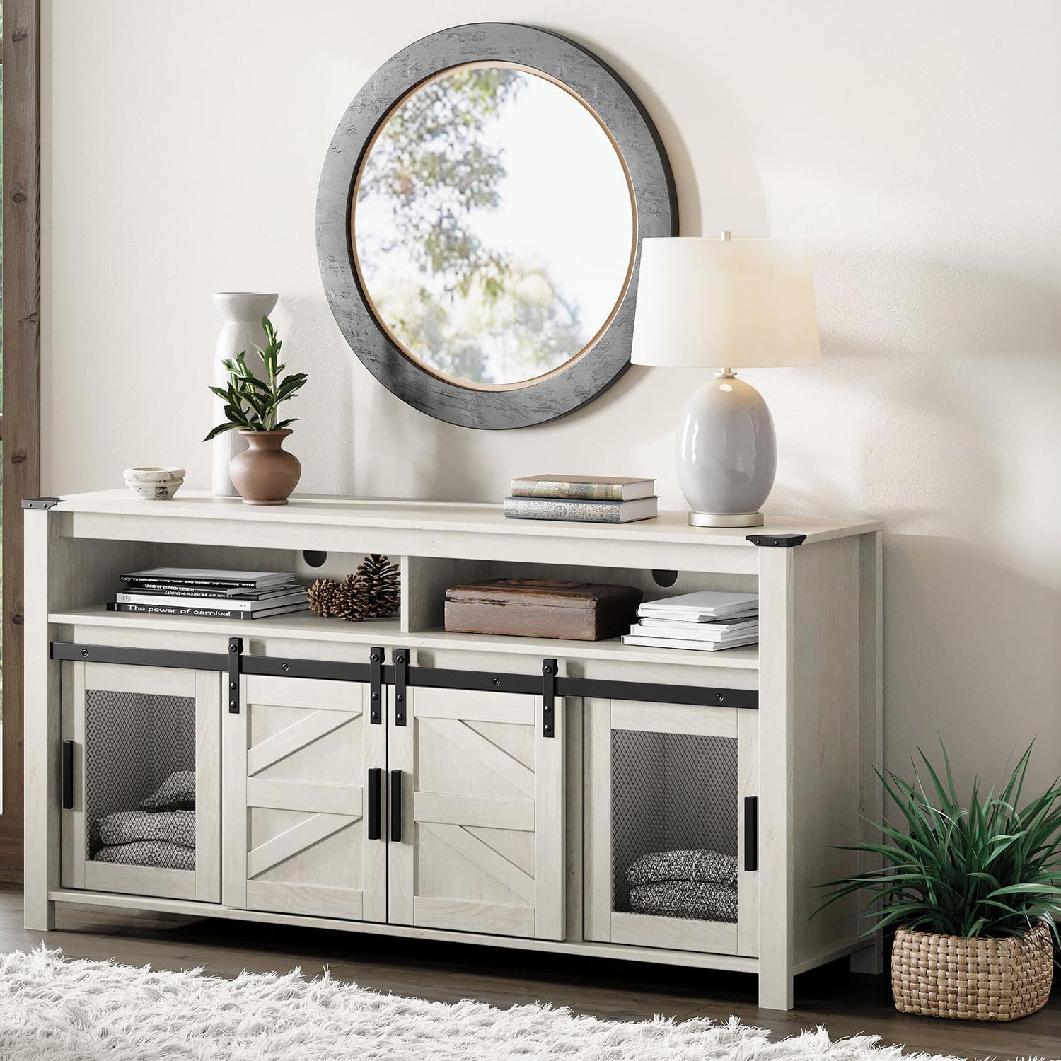 WAMPAT Farmhouse TV Stand for 65 Inch TV, Antique White Wood Entertainment Center with Sliding Barn Doors and Mesh Doors, Tall Media Console with Open Storage Space for Living Room, 59x15.4x31