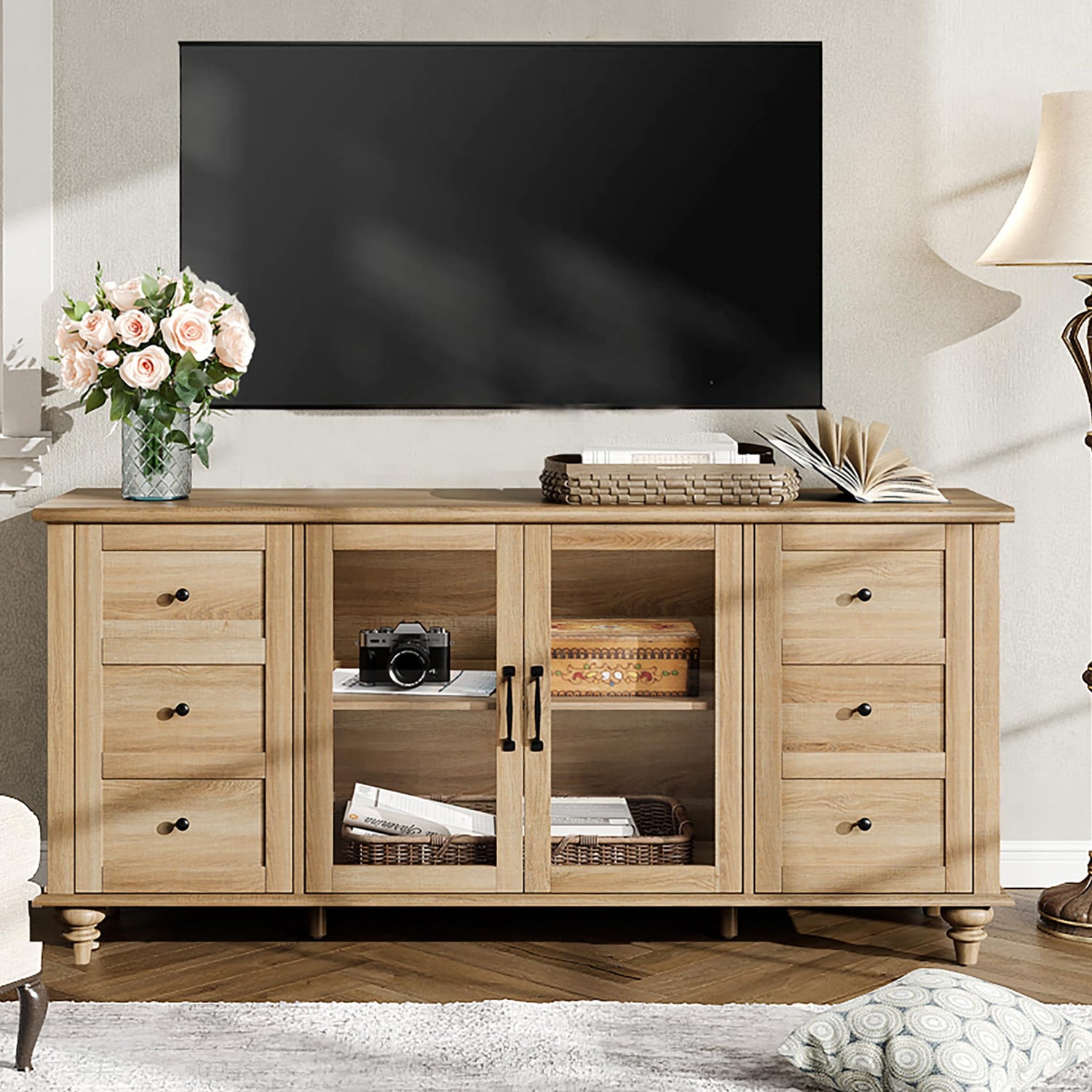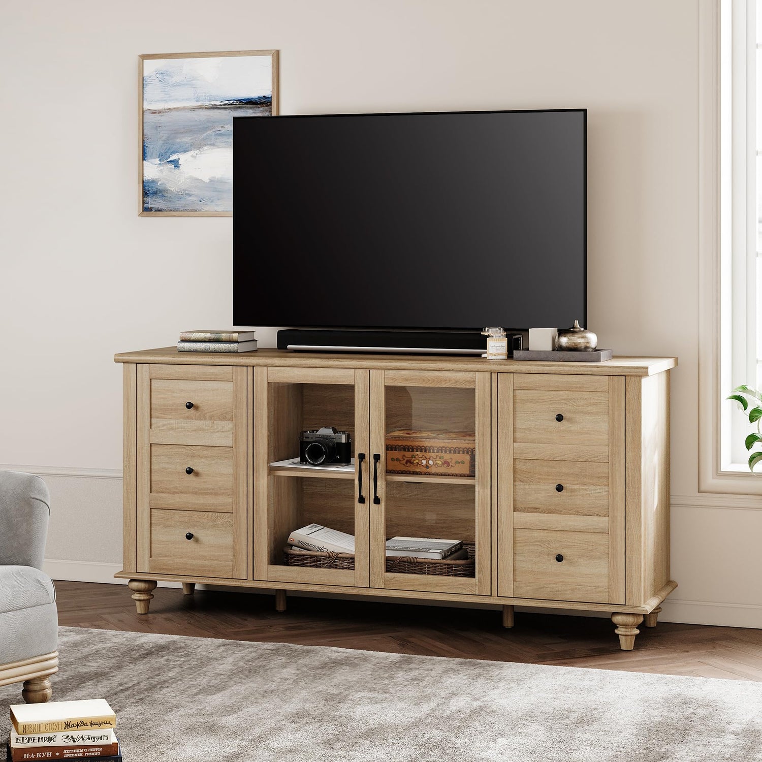 WAMPAT Glass Door Farmhouse TV Stand for TVs Up to 75 inch, Wood Universal TV Console Table with 4 Storage Cabinets, Entertainment Center for 32-75 inch TV Console Cabinet, 58'',Oak