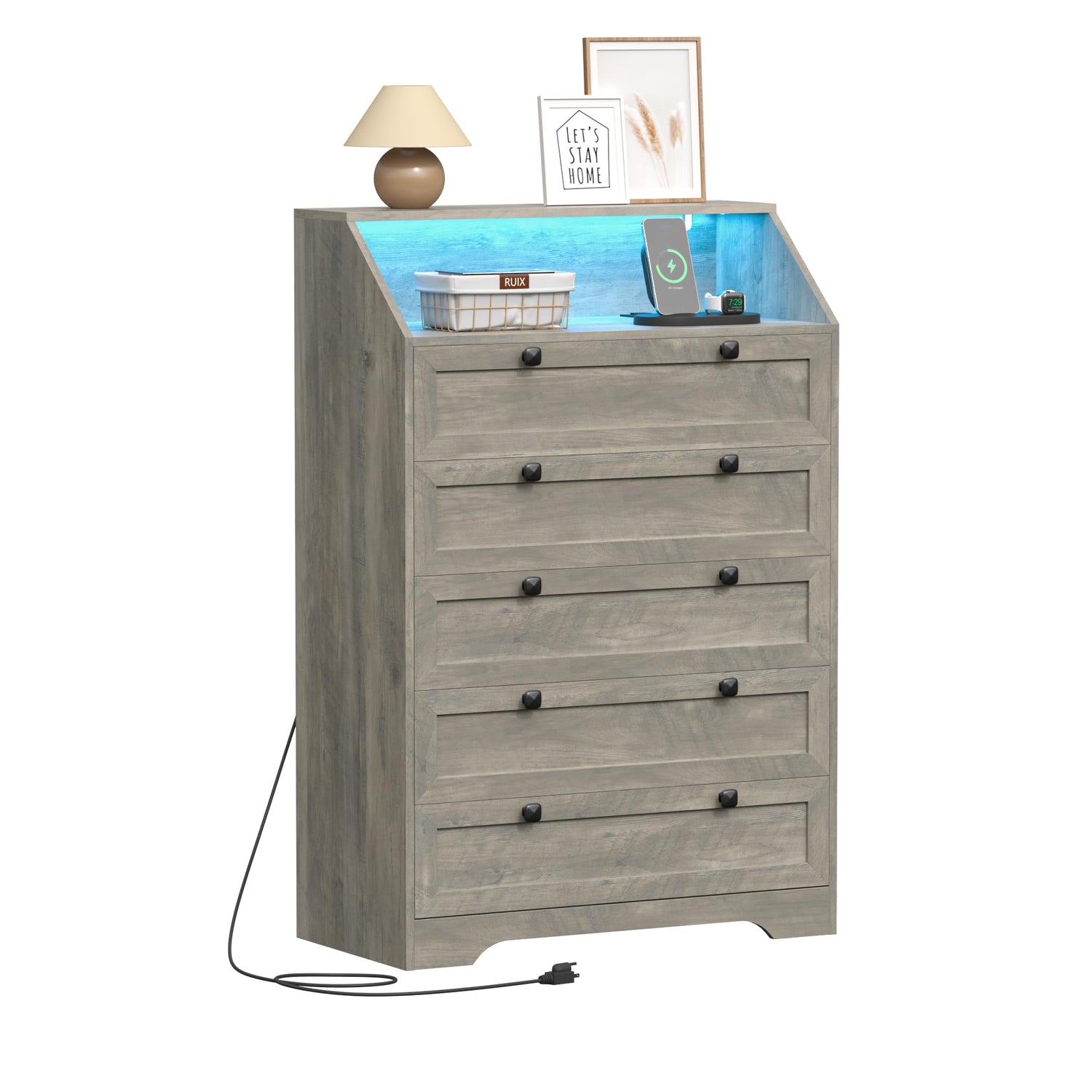 Wodeer Grey Dresser Tall 5 Drawer Dresser for Bedroom, Wood Chest of Drawers with LED Lights, Charging Station, Metal Handles, Modern Storage Cabinet and Organizer Drawers for Living Room, Hallway