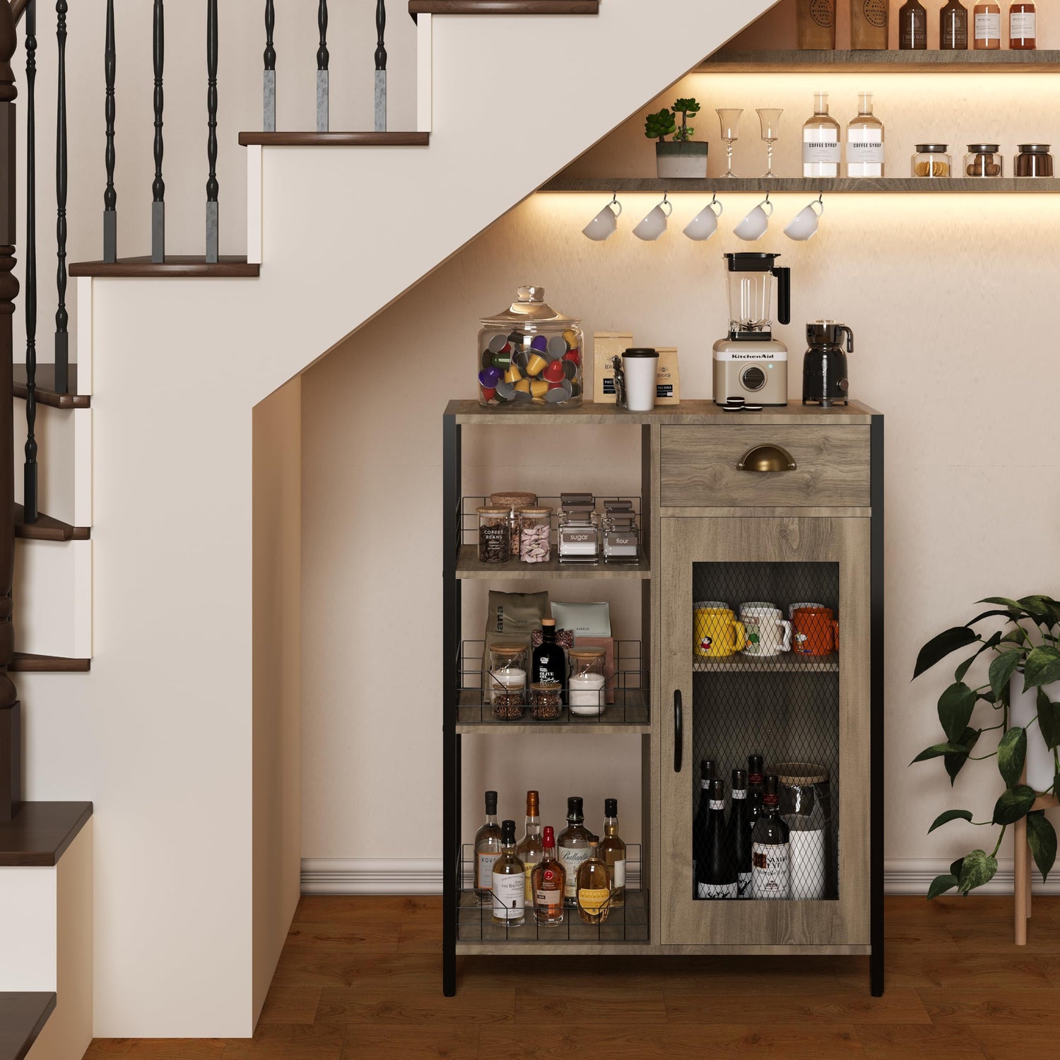 - Versatile Storage Space: Use the buffet sideboard storage cabinet to neatly store mugs, extra dishware, and other coffee and tea essentials. The spacious countertop is perfect for placing your coffee maker and beverage accessories. Consider adding a hanging mug rack above for an organised, stylish display.