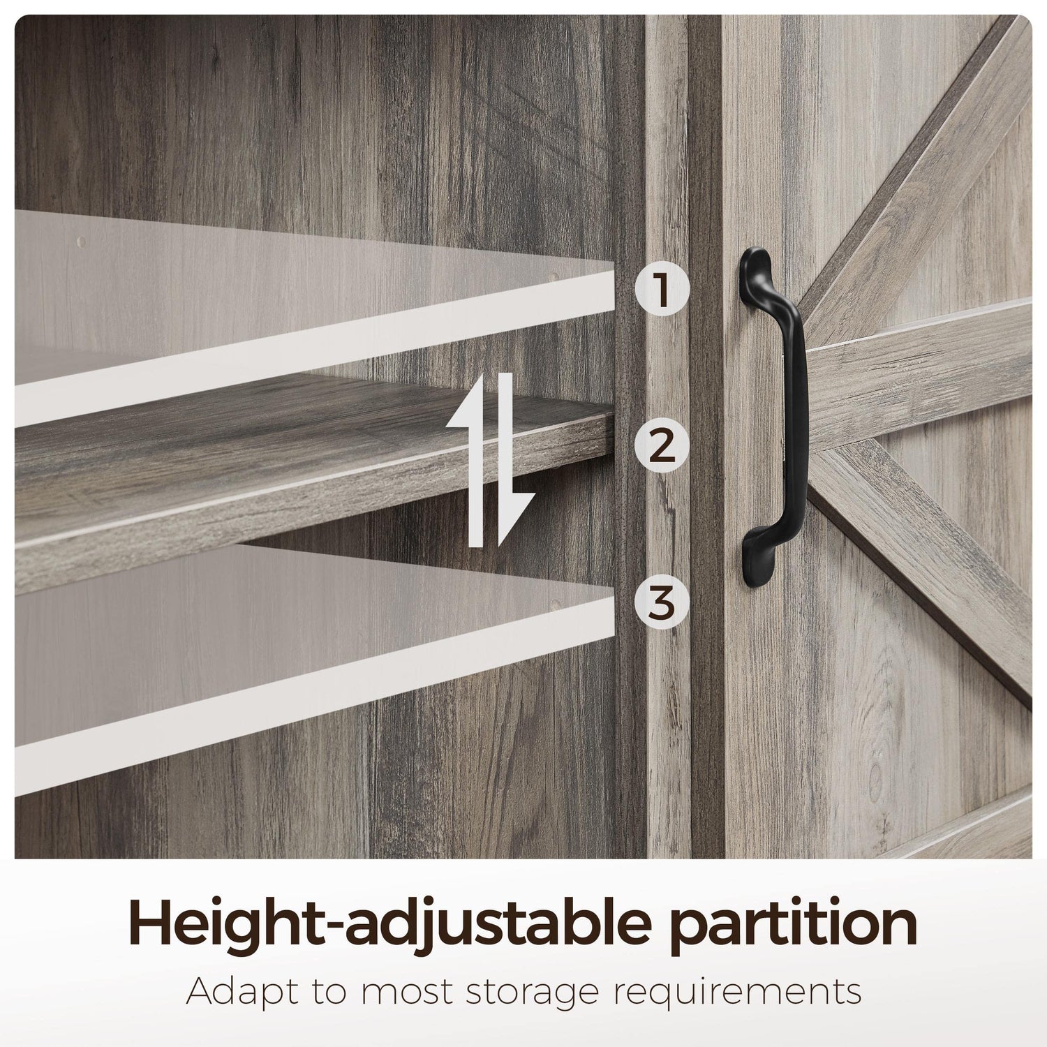 Details: People sometimes can’t help but long to live in a cabin located in a peaceful, clean village by a stream in the woods. When designing this TV stand series, this is the scene we had in mind. This farmhouse TV stand in particular is highlighted by its natural wood tone, crisp lines, and bold features. It can perfectly blend into lodges, modern farmhouses, rustic industrial homes, wooden-style lodgings, and Bohemia décor styles.The top of the stand suits a TV up to 65 in. Behind the barn doors are 3 columns of 2-layer storage shelves, improving the classification of your items and keeping your living space organized and tidy. The shelves of the central storage area can be adjusted by changing their height or removing the partition panel altogether.In addition to protecting the stand from being damaged by dust and water, the veneer coating also makes the maintenance of this storage TV stand effortless due to how easy it is to clean. With proper maintenance, this stand can be kept as good as new for a very long time.Specifications:Color: GreyMaterials: particle board, metal, CARB P2 MDFOverall dimensions: 58 x 16 x 25.5” (L x W x H)Top: 58 x 16” (L x W)Max. bearing:Top: 154 lbEach Partition: 22 lbGross weight: 87 lbNote:Please allow a 0.5” measurement tolerance.Please do not overload this TV stand.For your safety, please do not stand on the top of the TV stand.Package included:TV Stand*1Instructions*1