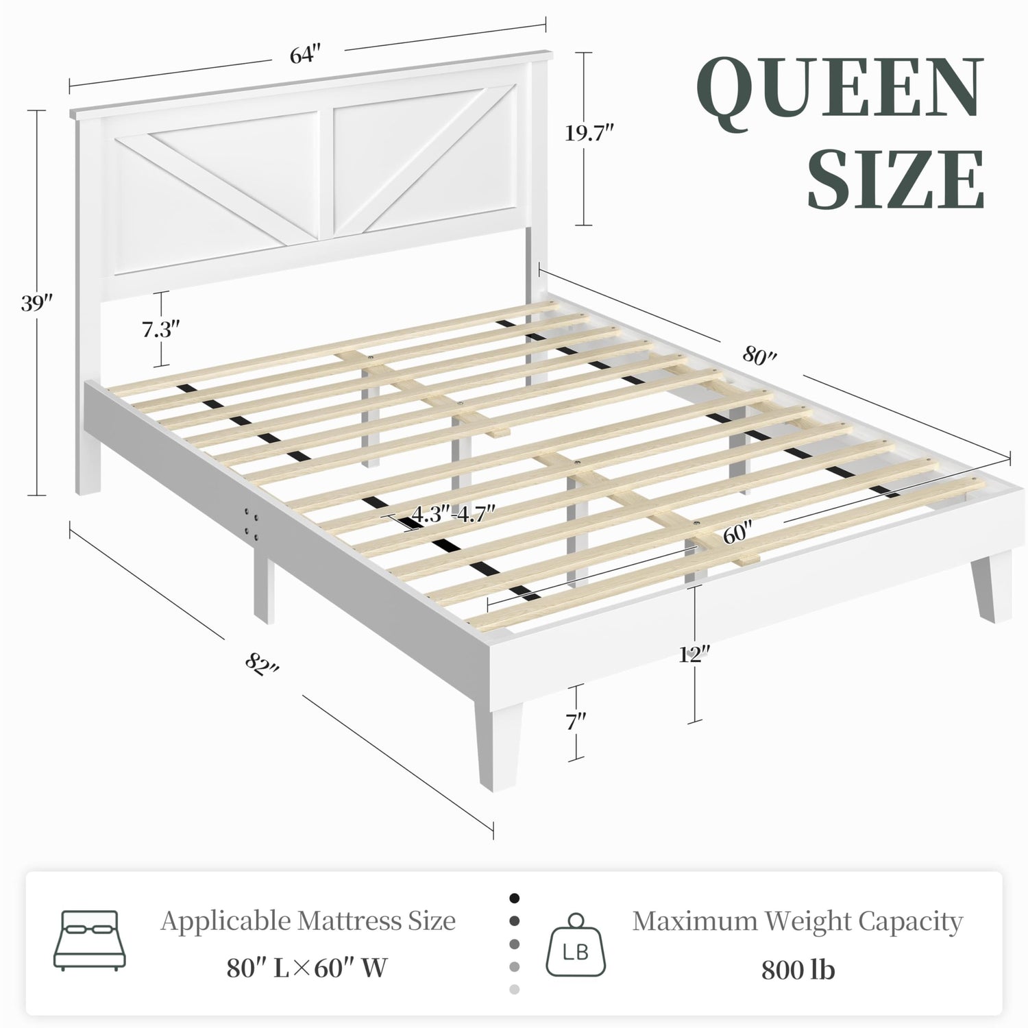 Yaheetech Wood Bed Queen, Farmhouse White Rubberwood Platform Bed Frame with V-Designed Headboard, Sturdy Wooden Support Slats, Holds up to 800 Pounds, Noise-Free, Easy Assembly