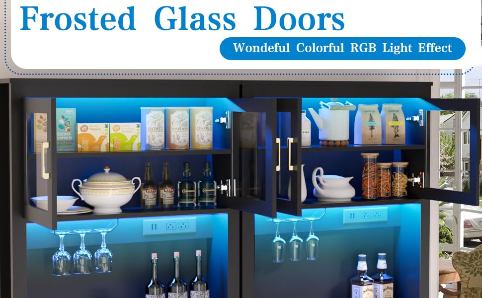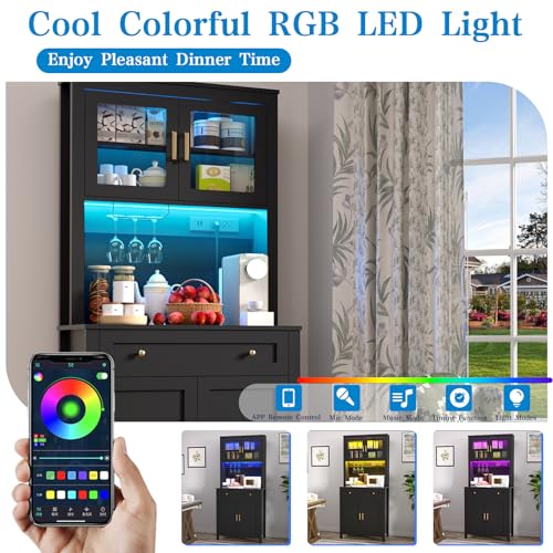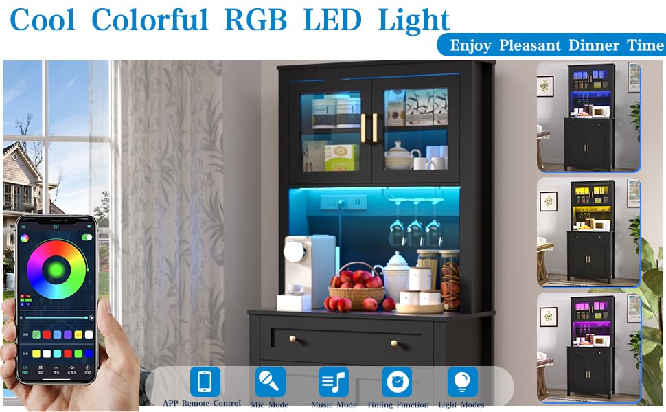 - 【Colorful RBG Light】The Tall Farmhouse Kitchen Pantry features a chic glass door on the top with colorful RGB light, you can change the light color and brightness Via the mobile phone APP and enjoy a wonderful home decor atmosphere. Our RGB light APP also has different functions such as multicolor change mode, Light Modes, Mic Mode, and Timing Functions.