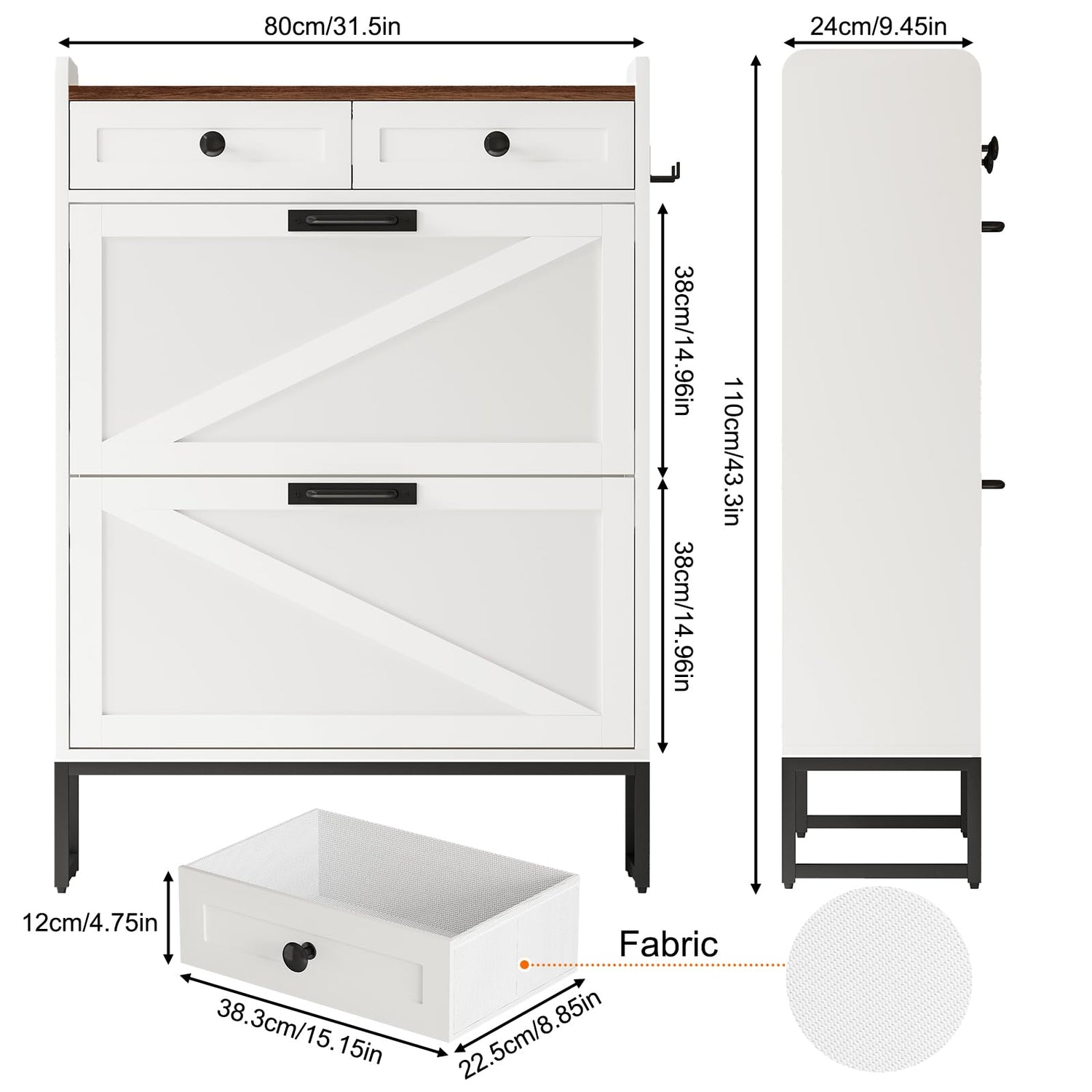 - Large Capacity Shoe Cabinet: There are two layers of storage space in each of the two flip drawers, which can accommodate flat shoes, loafers, high heels, and small and medium-sized sports shoes. This shoe cabinet can hold them all. The top can hold bags and pet supplies, the side hooks can hang umbrellas, and the bottom can hold home shoes, reducing clutter at the entrance or in the home.