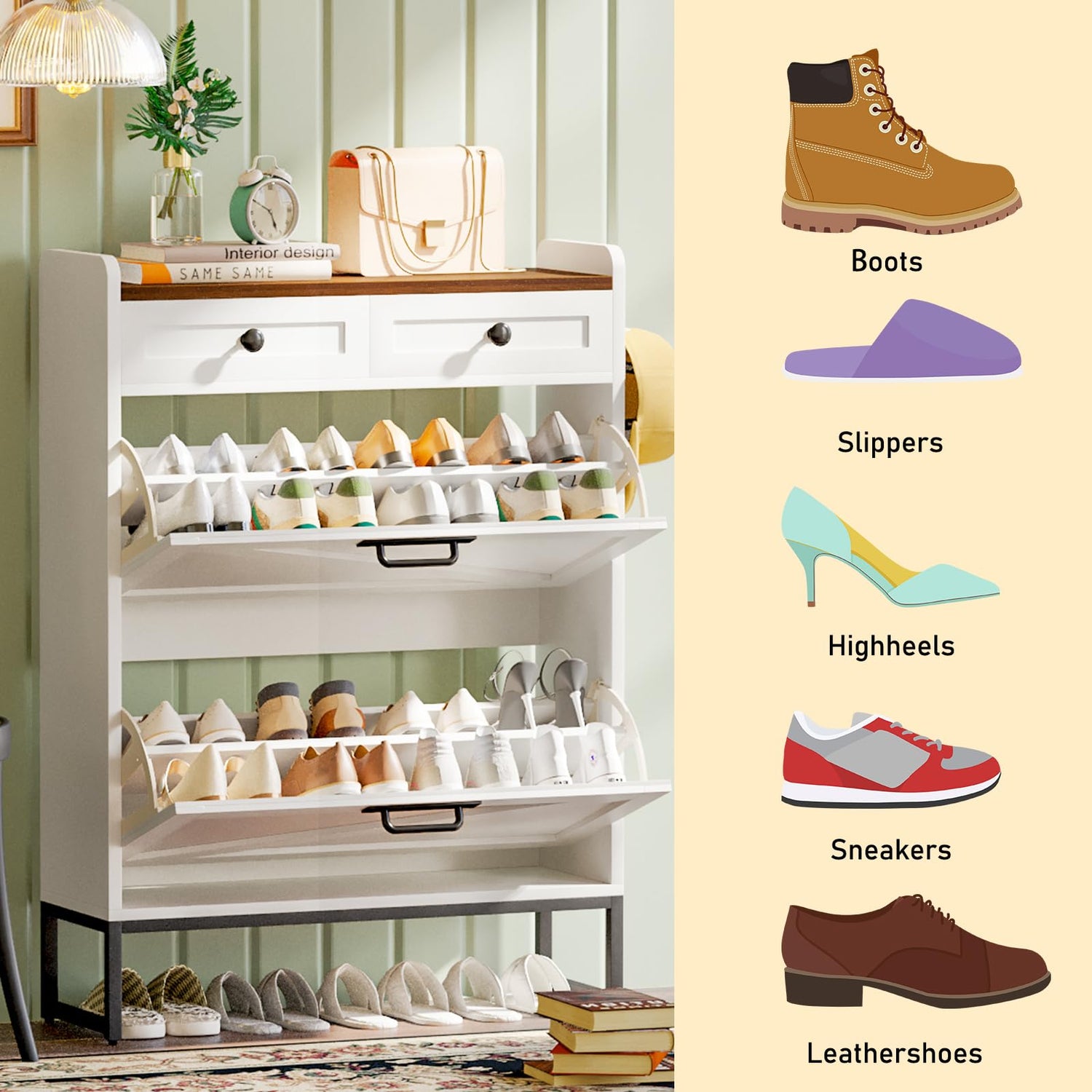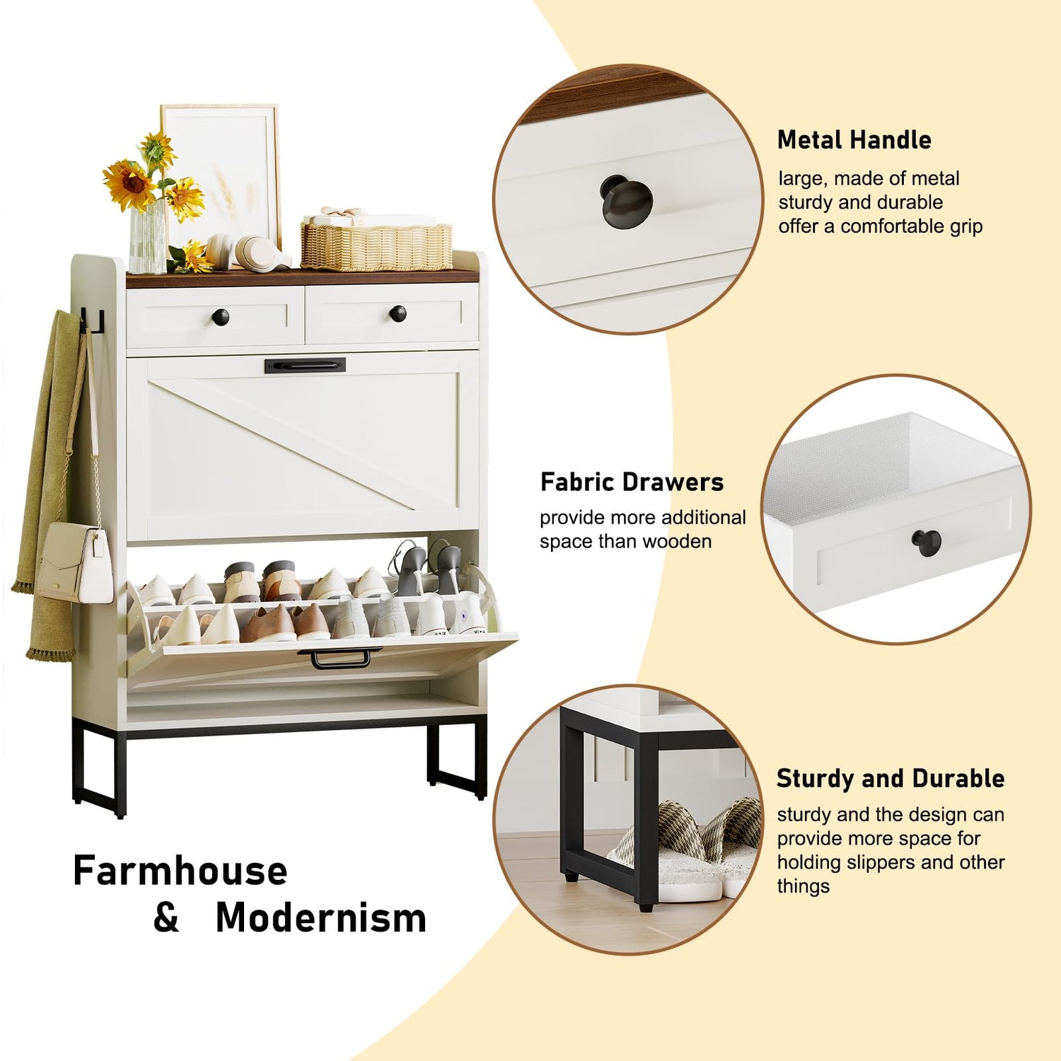 YGEOMER Shoe Cabinet Storage for Entryway, Farmhouse Shoes Organizer Rack with 2 Flip Drawers and 2 Fabric Drawers, Narrow Slim Shoe Cabinet for Door Entrance, White