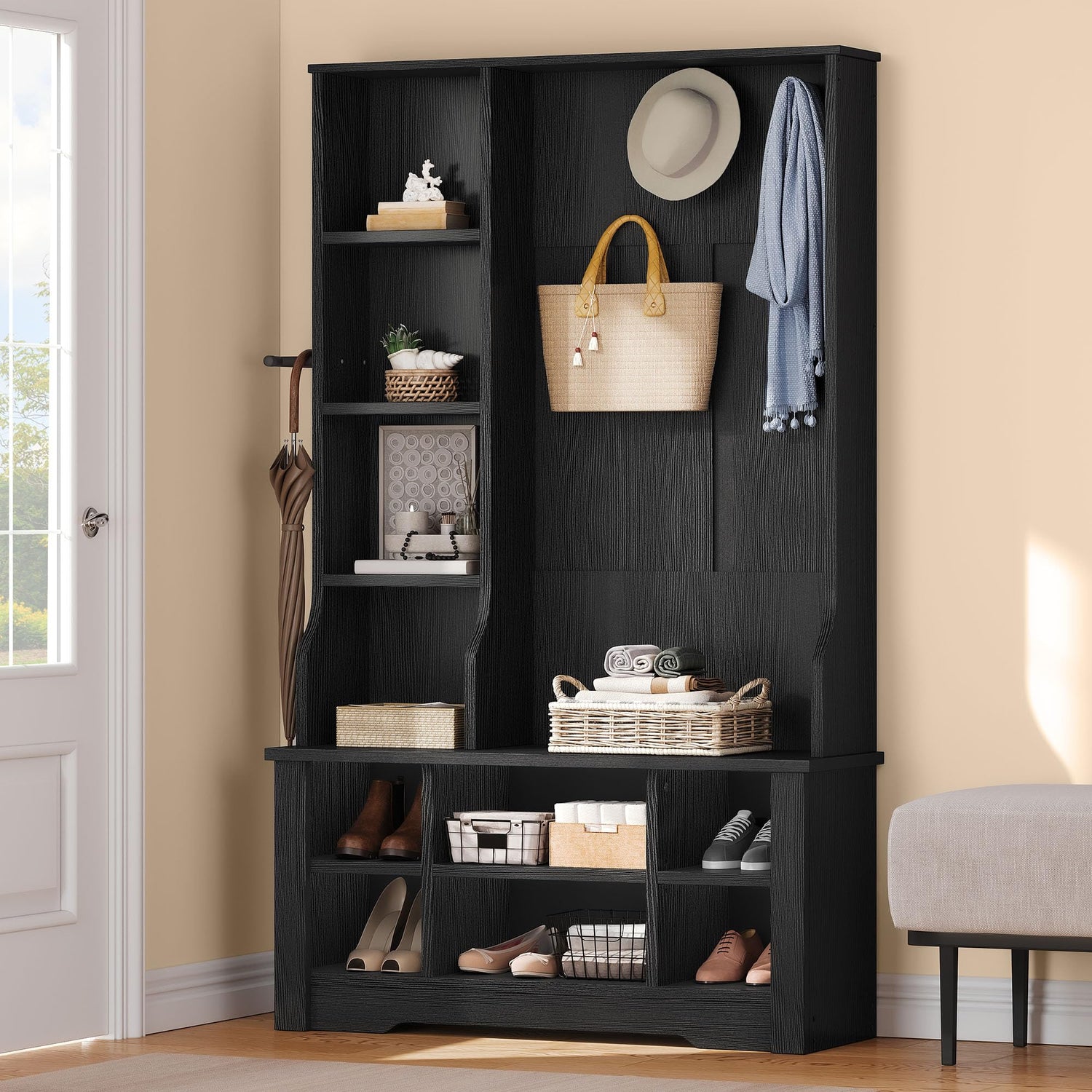 - Space-Saving Storage Solution: This hall tree is your one-stop organizer. With a roomy shoe bench, 5 solid coat hooks, 6 spacious shoe compartments, 4 side shelves, and an umbrella holder, everything you need is right where you want it. Tidy up and stay organized in an instant