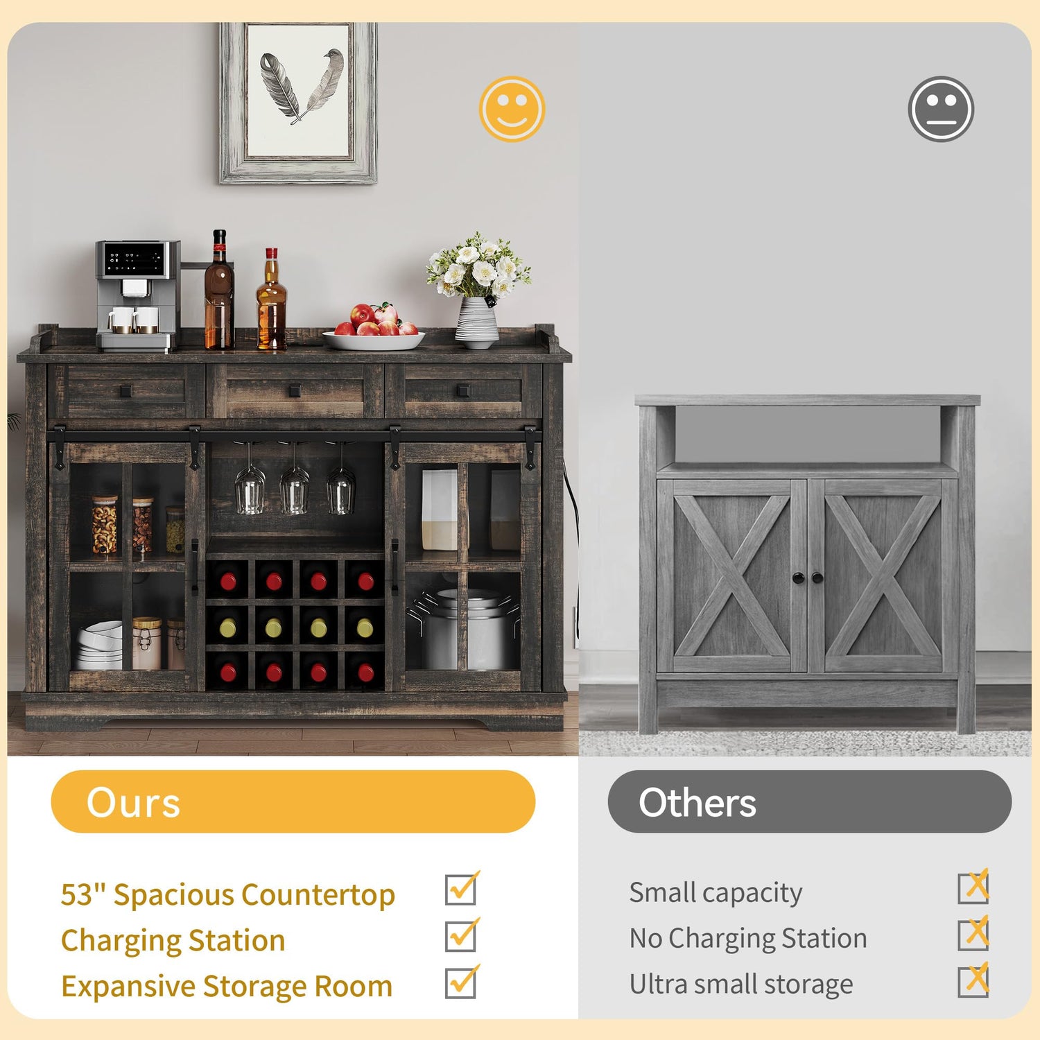 YITAHOME 53" Wine Bar Cabinet for Liquor and Glasses, Farmhouse Kitchen Sideboard Buffet Coffee Bar Cabinets with 3 Drawers and Glass Sliding Barn Door for Kitchen & Living Room, Dark Rustic Oak