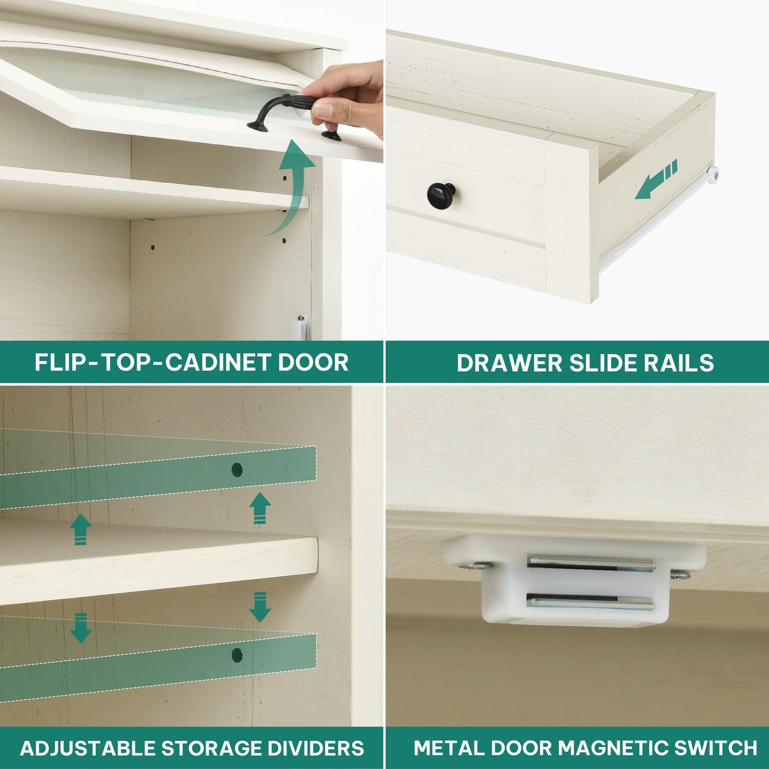 • Roomy Storage: Our lift-up doors ensure quick access while adding a sleek touch. The spacious countertop fits coffee makers and more, while two drawers and lower cabinets with adjustable shelves keep dishes and kitchen tools neatly organized