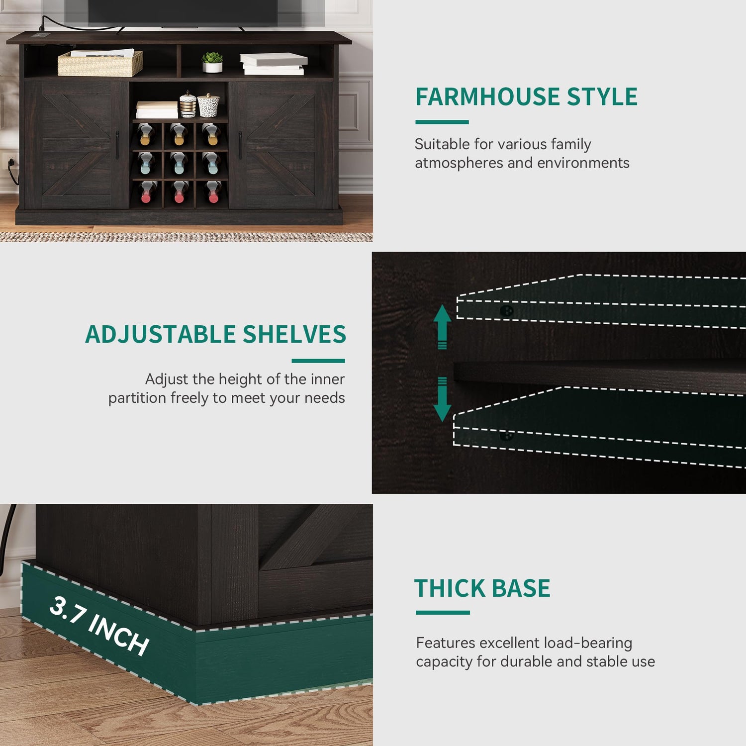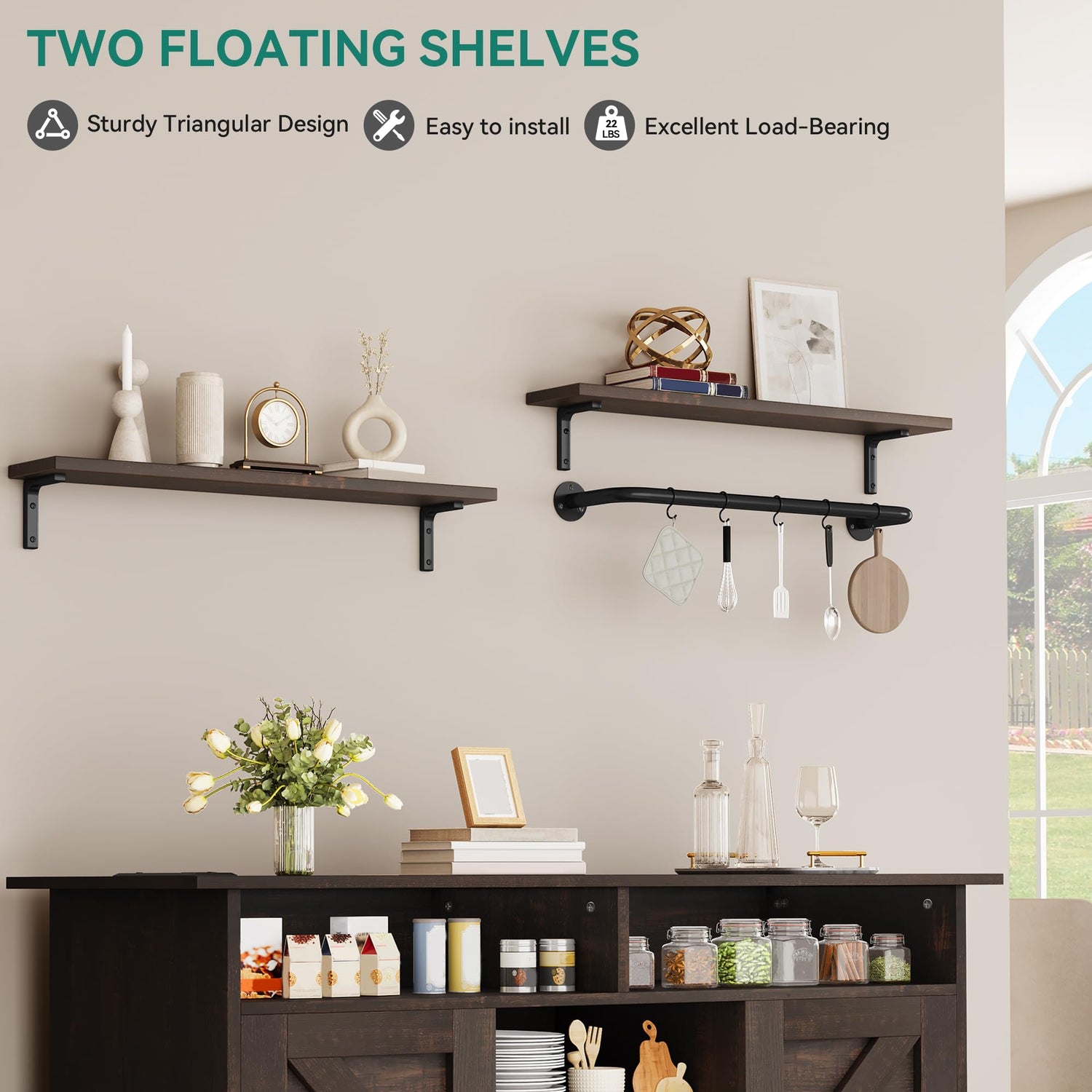 Details: The YITAHOME Farmhouse Sideboard Buffet Cabinet is a versatile and well-designed piece that meets various storage and functional needs. Its spacious countertop and integrated power outlet facilitate easy charging of devices. The floating shelves and hanging rod offer additional storage, ideal for condiment jars, small bottles, and cups. With open storage compartments and adjustable barn door cabinets, it provides flexible storage for snacks, plates, wine bottles, and more. This multifunctional cabinet can serve as a coffee bar, sideboard, pantry, or TV stand, enhancing your kitchen, living room, or dining area.