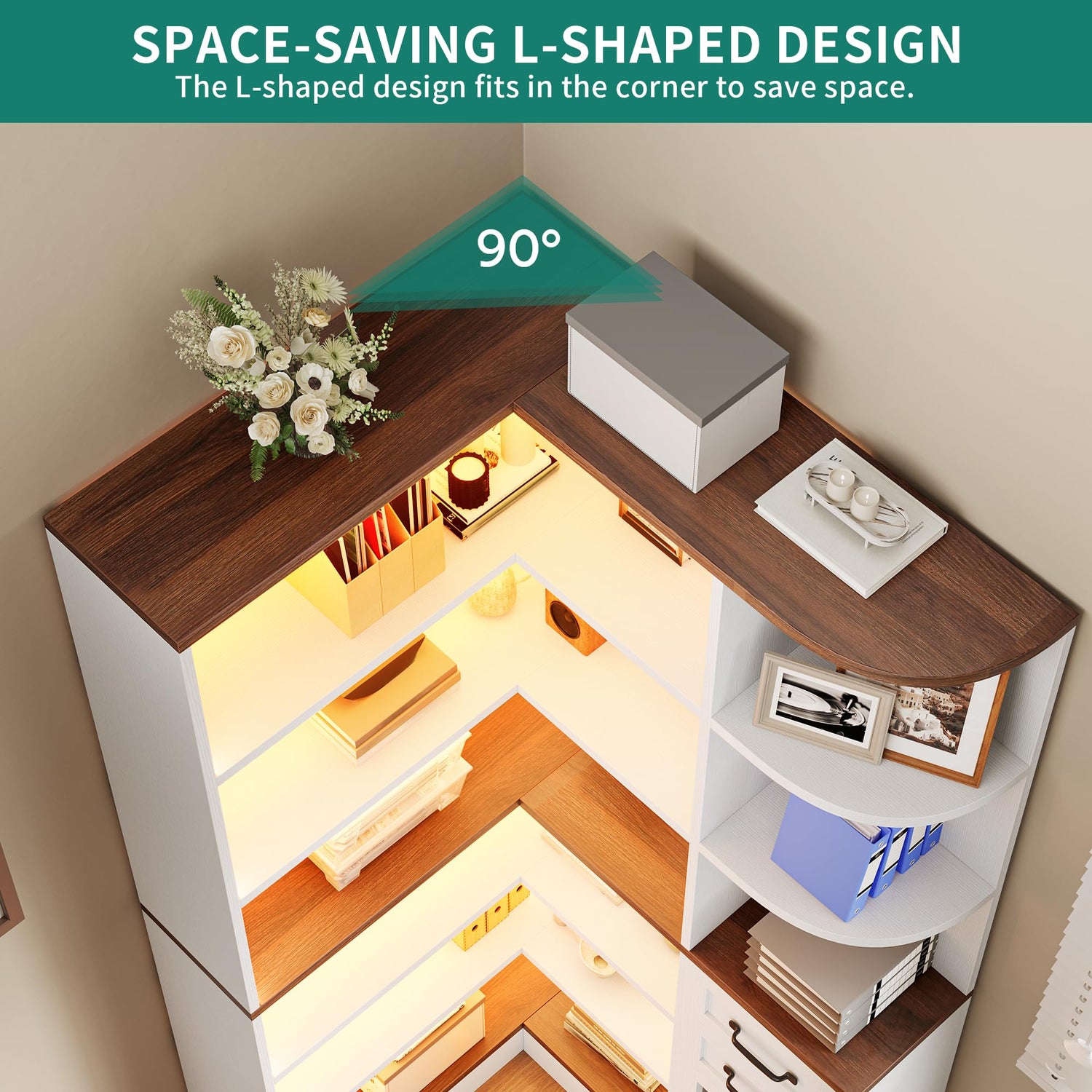 YITAHOME Corner Bookshelf with Storage, Farmhouse 6-Tier Bookshelf with Drawers and Cabinets, L-Shaped Bookcase LED Lights Corner Display Shelf for Home Office, Living Room, Bedroom