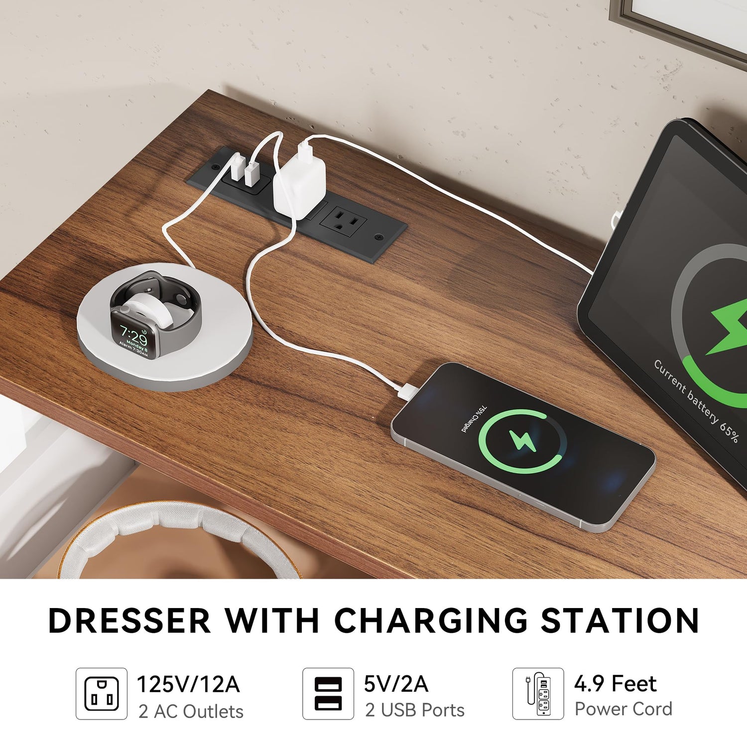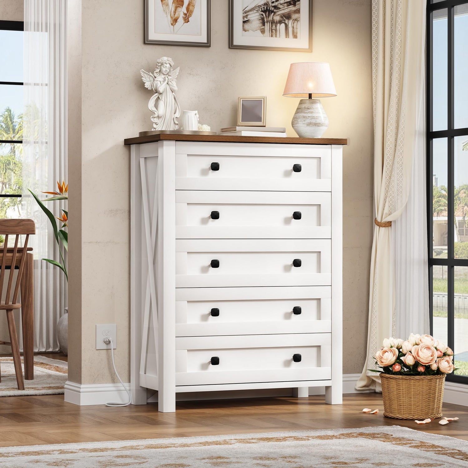 YITAHOME Farmhouse 5 Drawer Dresser for Bedroom with Power Outlets, Modern Tall Nightstand with Deep Drawers, Wood White Closet Dresser for Living Room, Entryway, Hallway