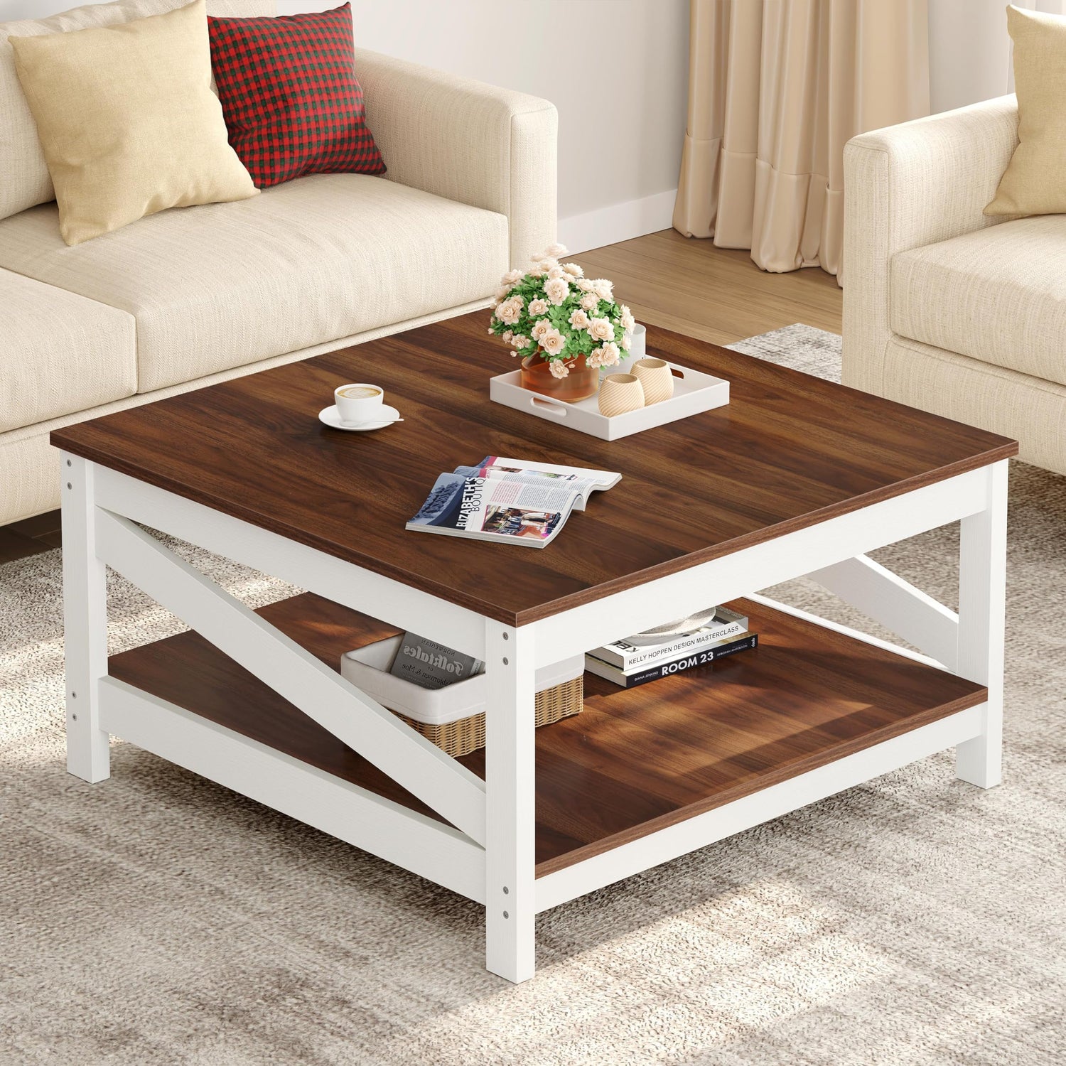 YITAHOME Farmhouse Coffee Table,Square Coffee Tables for Living Room,White Coffee Table with Storage,Wood Coffee Table with Sturdy Shelves,White
