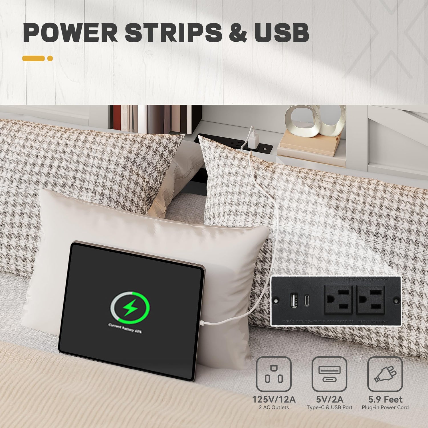 - Integrated LED and Power: The headboard includes built-in LED light strips with remote-adjustable color & frequency, as well as power strip (2 x 3-prong outlets, 1 USB port, and 1 USB-C port) for added convenience and functionality to your LED farmhouse bed, ideal for late-night reading or charging devices
