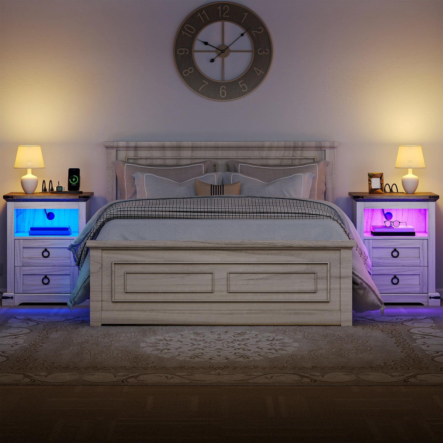 YITAHOME Farmhouse Nightstand with Charging Station, 2 Drawers Night Stand for Bedroom, LED End Table Side Table w/Open Shelf, Set of 2, Off White+Walnut Grain