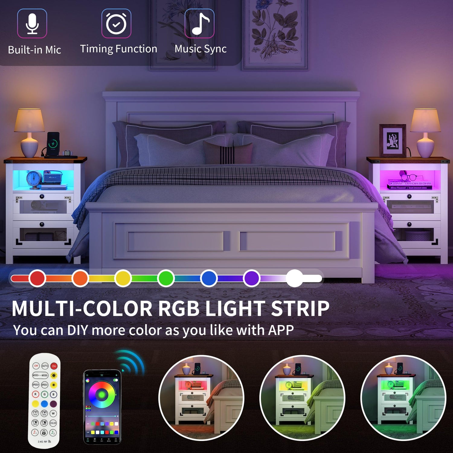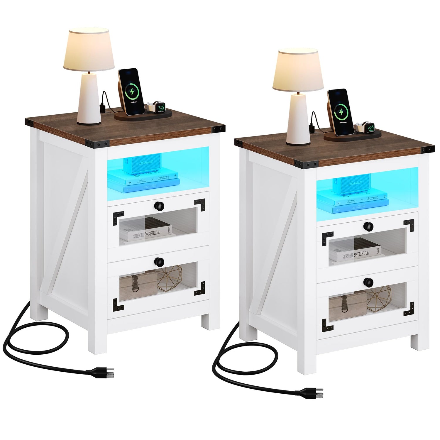 YITAHOME Farmhouse Nightstand with Charging Station, 2 Drawers Night Stand with LED Lights, Wood End Table Side Table with Storage, Walnu + White