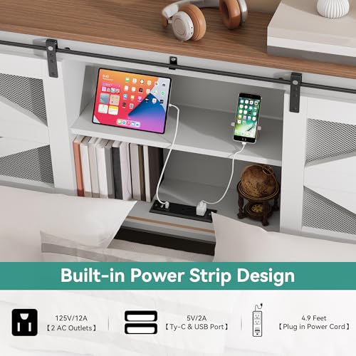 YITAHOME Farmhouse Queen Size Bed Frame with Headboard, Bookcase Storage Shelves, Sliding Grid Barn Door, Charging Station, Rustic Wood Platform Bed, No Box Spring Needed, White