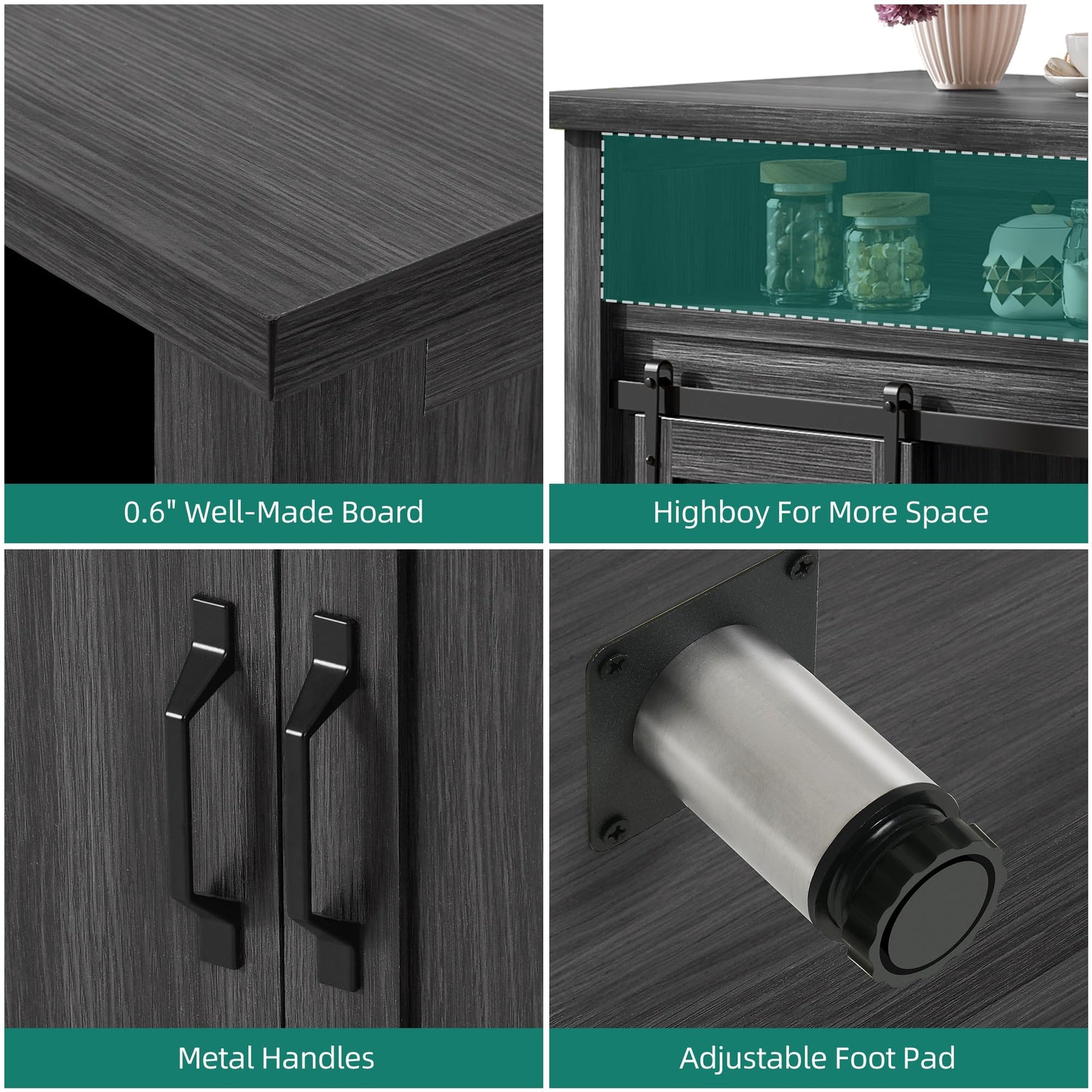 - Large Size Storage Cabinet: This storage cabinet equipped with 4 doors – 2 sliding barn doors and 2 visual grille doors. Its 63 inch wide countertop provides ample space for lots of kitchen essentials. Inside, there are 7 roomy storage shelves with adjustable shelves, which allows you to neatly store items of all shapes and sizes