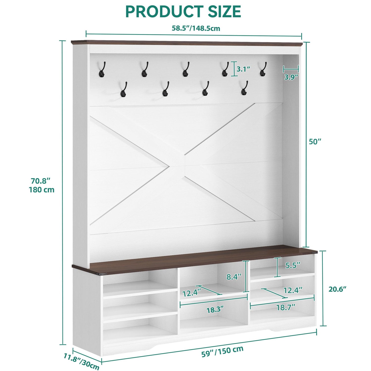 - Rustic Farmhouse Hall Tree with Bench: The warm walnut and white finish, combined with textured wood and mesh details, brings a cozy farmhouse vibe to any space. The mud room bench with storage and seating is both a stylish and functional addition to your entryway, hallway, or mudroom.