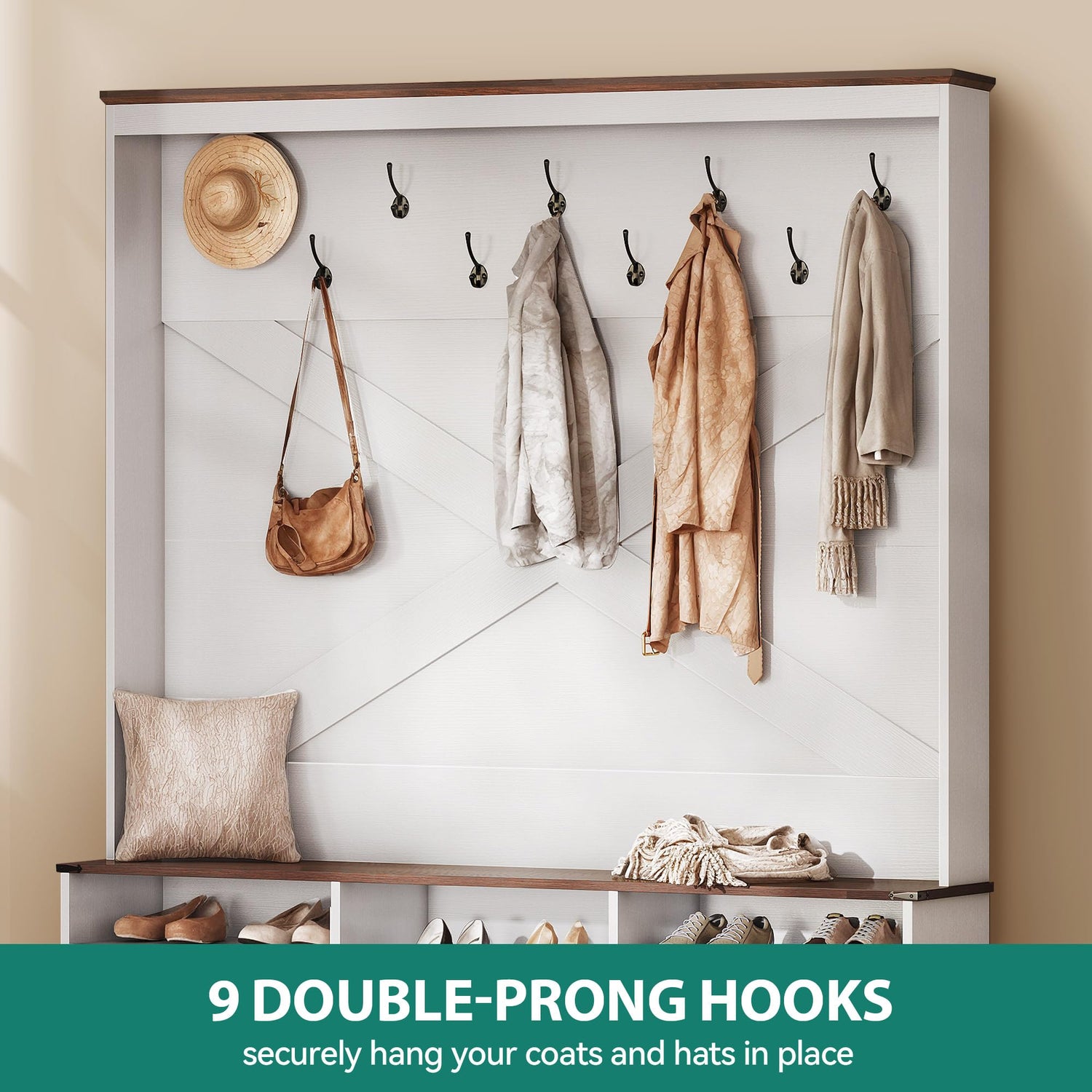 YITAHOME Hall Tree with Bench and Shoe Storage, Mudroom Storage Modern Shoe Cabinet with Bench & 9 Double Prong Hooks, for Entryway & Living Room, Walnut & Off-White