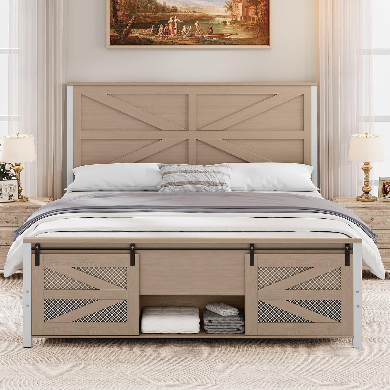 - Sliding Barn Door Storage Cabinets: The queen bed frame with storage at the footboard can store books, clothes or small item. Sliding barn door equipped with delicate metal rails and classic farmhouse-style elements combine to give you the ultimate in beauty.