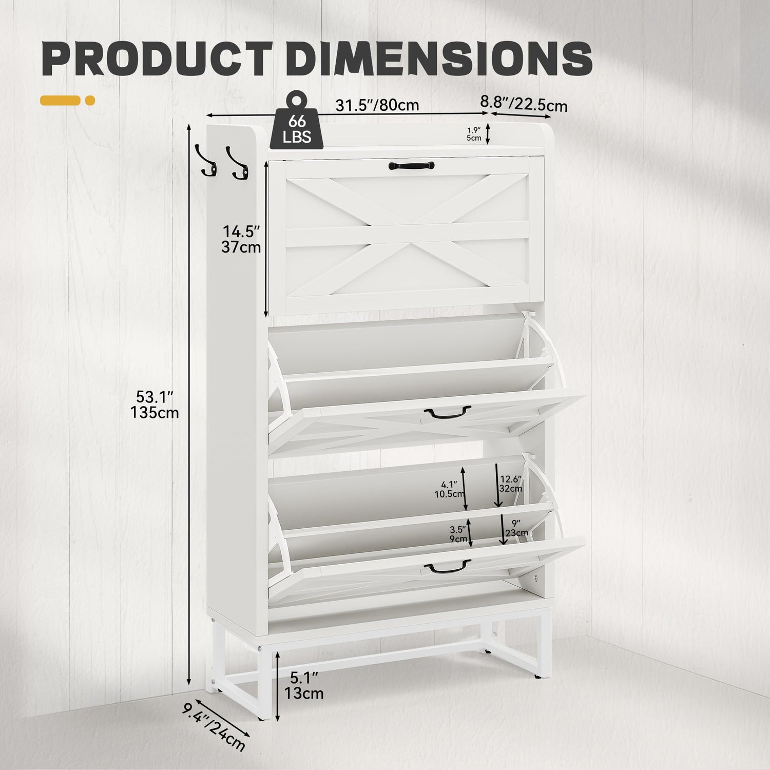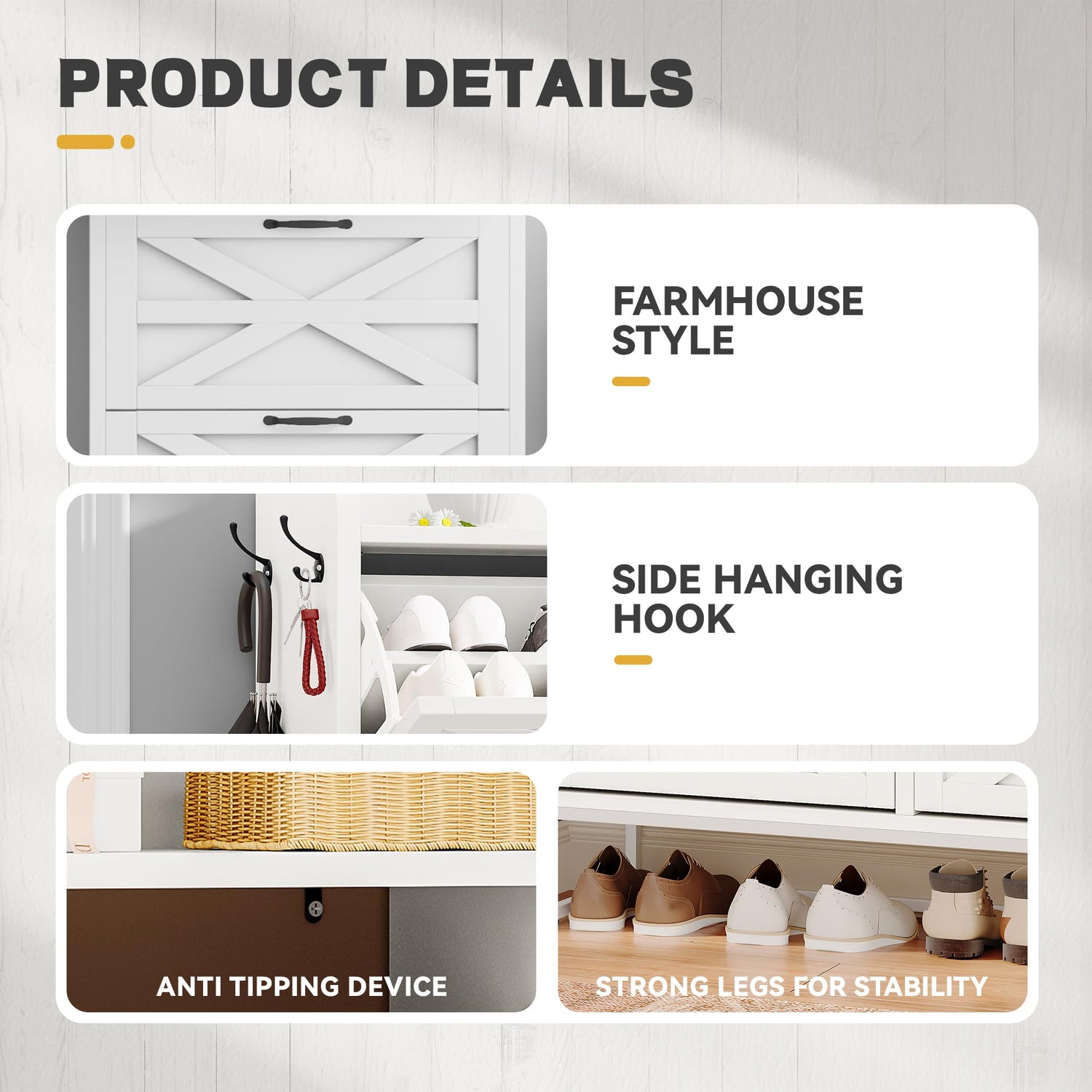 - Timeless Farmhouse Design: Equipped with 3 flip drawers featuring adjustable slots, accommodating diverse shoe sizes; easily removable shelves for larger footwear