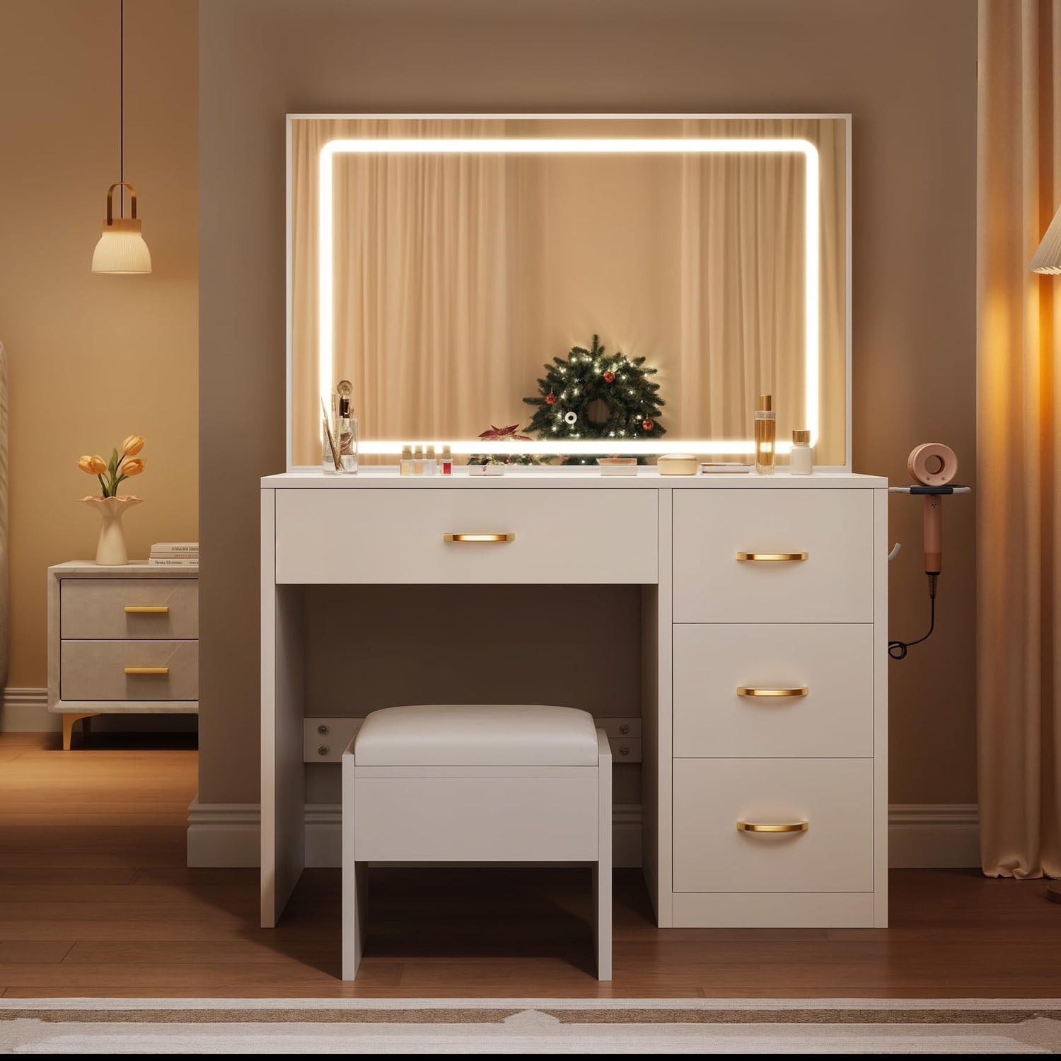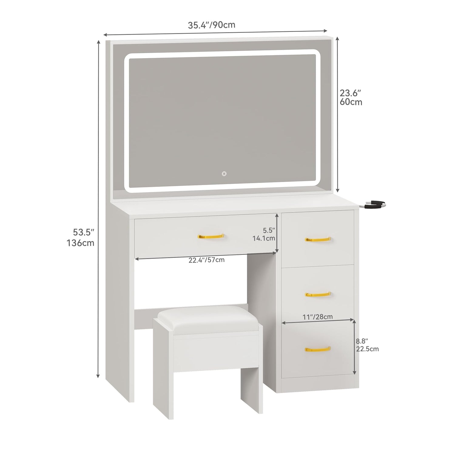 Details: This sleek vanity set features a 35" wide mirror with adjustable LED lighting, offering the beautiful glow for any occasion. With 2 AC outlets and 2 USB ports, you can power your styling tools and charge devices easily. Four smooth-gliding drawers and a side hair dryer holder keep everything organized and within reach. The faux leather cushioned stool adds comfort and style to your routine. Crafted from durable engineered wood, this vanity table set is built for daily use and blends practicality with elegance.Product specifications are as follows:- Dimensions: Vanity Desk - 35.4" (W) x 15.7" (D) x 53.5" (H)Stool - 15.6" (W) x 15.6" (D) x 16.7" (H)- Material: Sturdy Engineered Wood & Faux Leather- Assembly required: Yes, instructions included