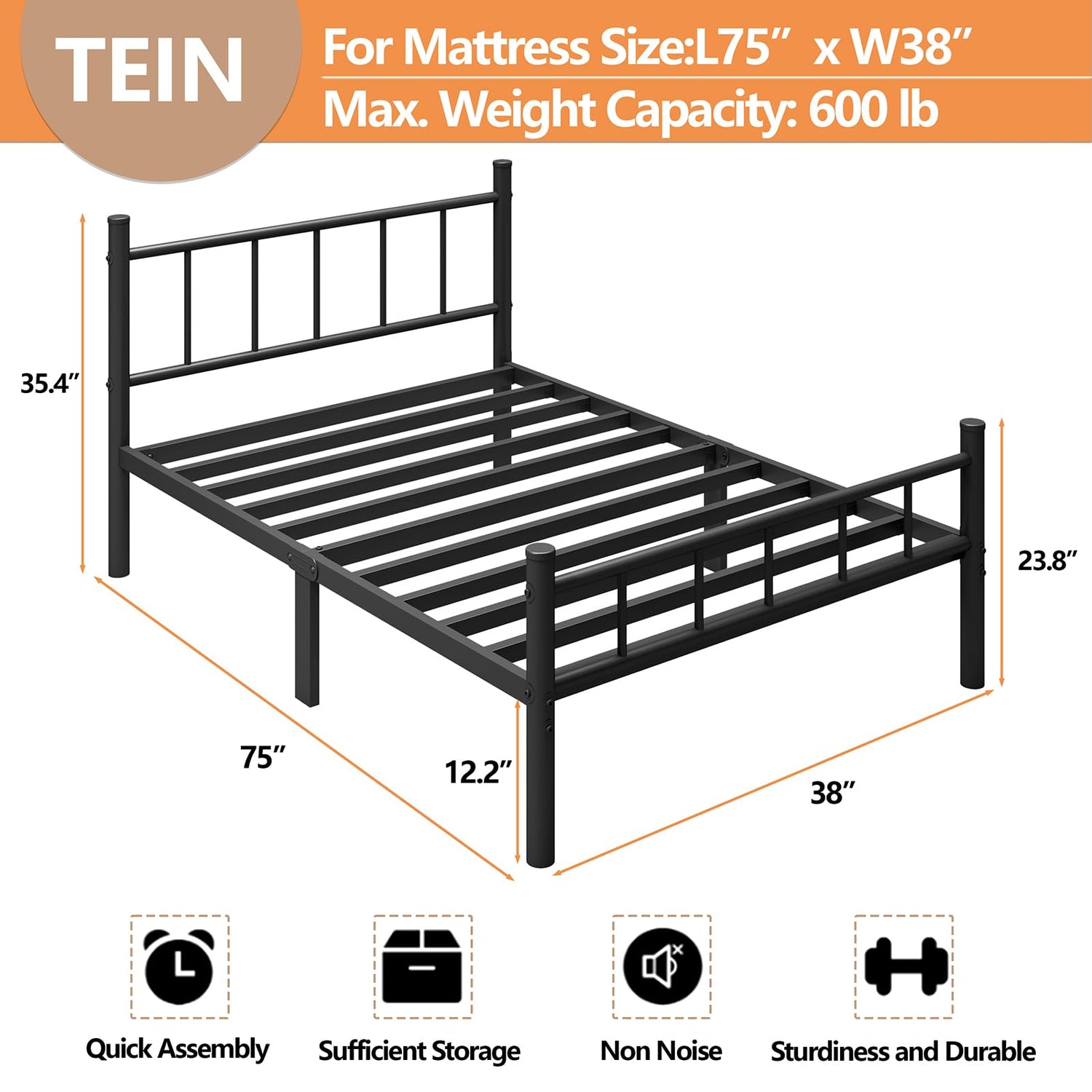 - No Box Spring Needed: Stable steel slats provide firm direct mattress support for all mattress types. Twin size:74.5"x37.5"x14",max weight:2500lbs