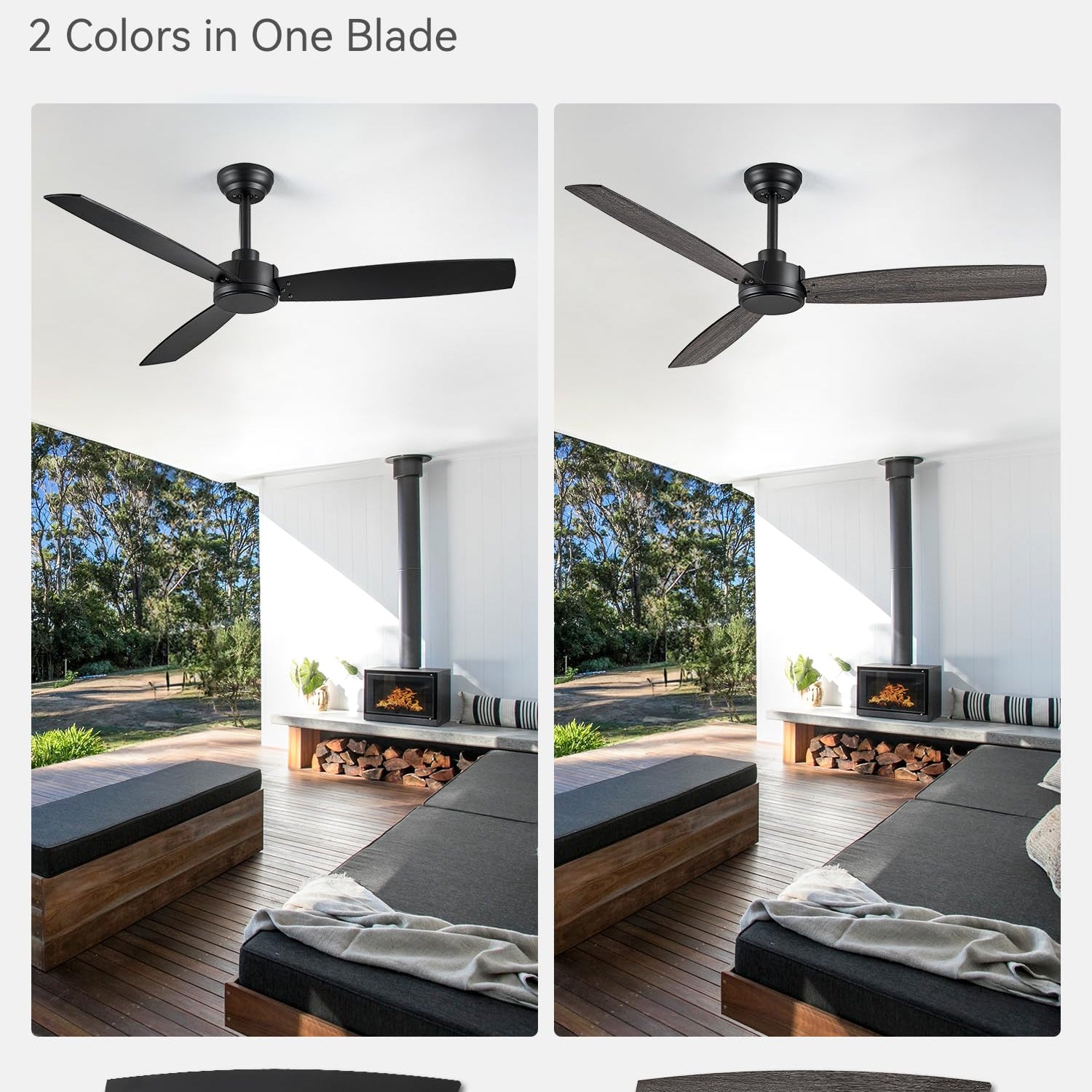 - Double-Sided Blades: The 2 pack ceiling fans without light have 2 colors on each blade - one side has a pure black finish, and the other features a black wood grain. The outdoor ceiling fan’s dual-color vibe easily fit different styles, whether you're going for a modern look or farmhouse chic. It's the perfect way to spruce up your home decor