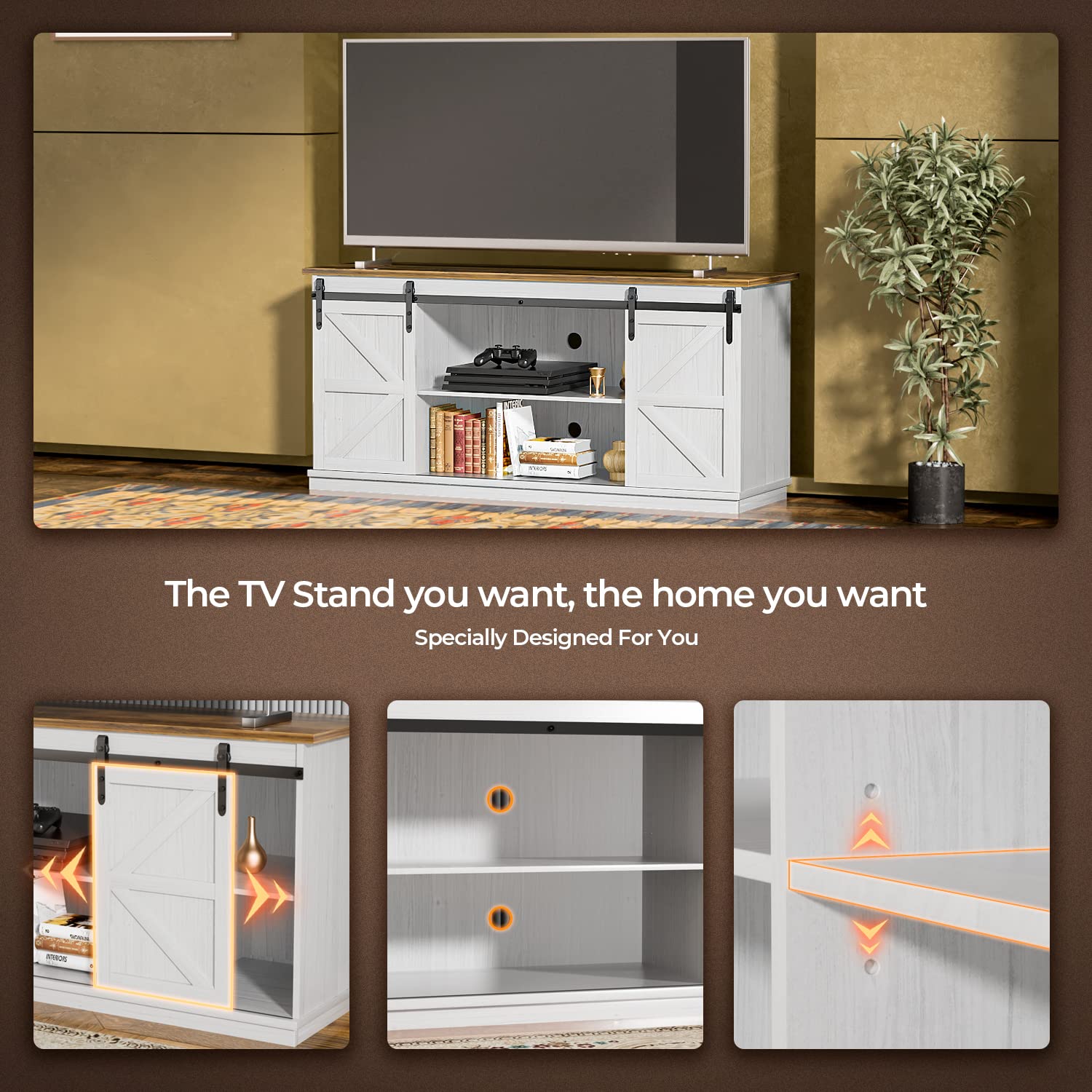 - 【Large Storage Space】: This TV stands comes with a large table top, two open center compartments, 2 sliding barn door and two side storage shelves. Two side 2-tier storage shelves of white TV stand are convenient for placing your books, decorations and other items. This TV stand with storage and doors shelves can maximize keep living room clean and tidy.