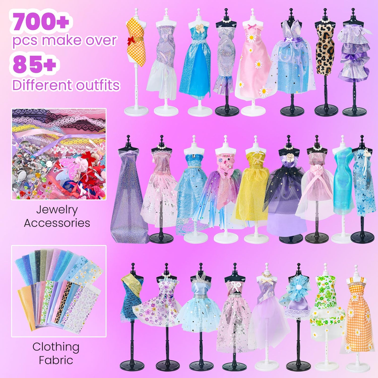 - 【700+ Surprises in One Gift Box】This newest fashion designer kit includes everything you need for sewing and designing : 5 mannequins to display, step-by-step instructions, clothes templates, 27 fabrics, sewing tools, scissors, disappearing ink marking pen for drawing, hundreds of shining decoration accessories like diamond sticker, bows,laces and ribbons. The high quality materials are durable and can be used in the long run. We also provide velcros using on the back of dress for easy on and off. It’s the best kit for beginners who love design