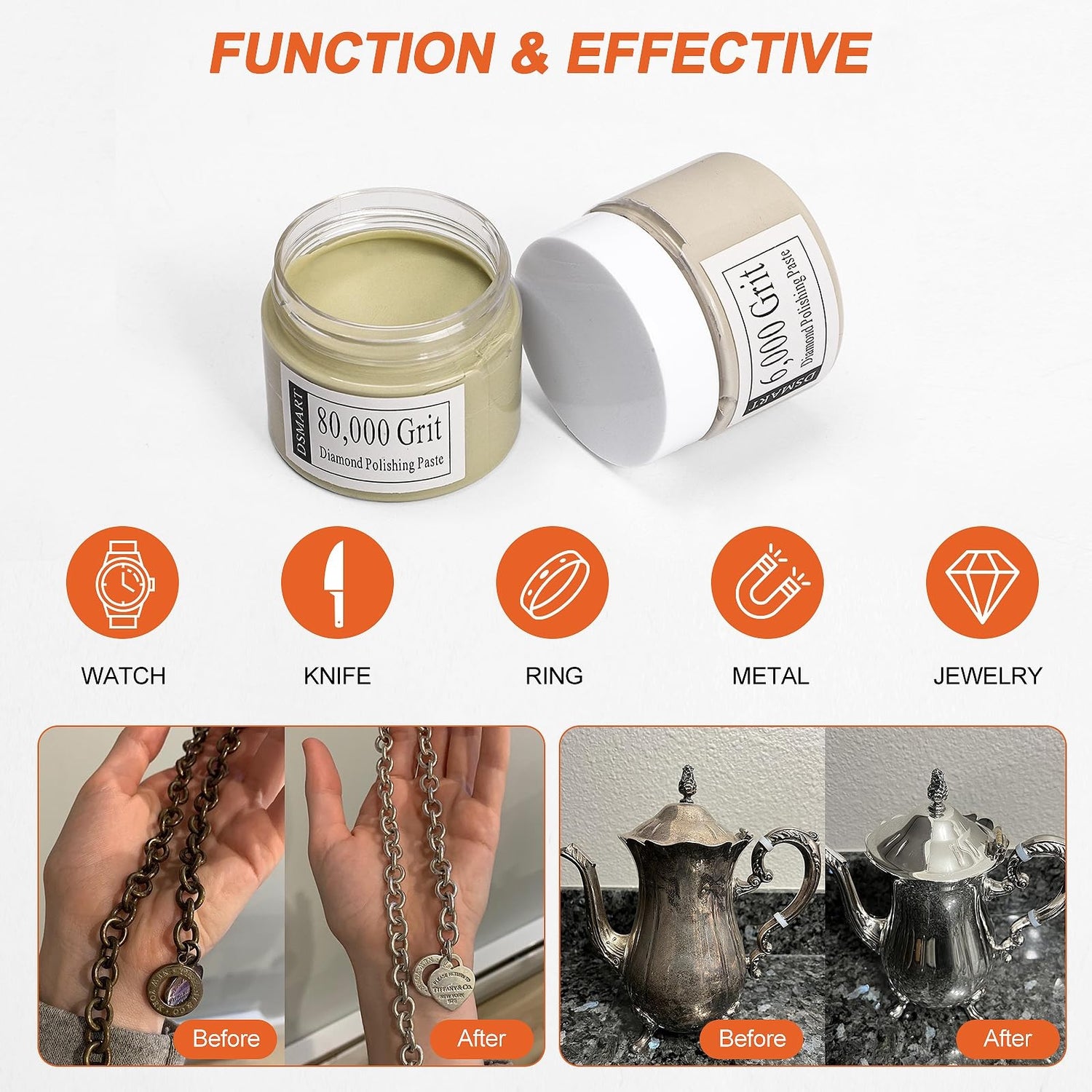- 【Versatile & Multiple Applications】- This diamond paste can be used as polishing & grinding compound for hard metal, jewelry (rings, necklace etc) cleaning & renewing compound, stropping compound for knives sharpening, mirror and glass & watch lens scratch removing, watch & gun polishing, epoxy polishing paste, rock & crystal polishing compound and buffing compound, resin polishing, abrasive paste, granite compound etc. It is compatible for almost all the materials.