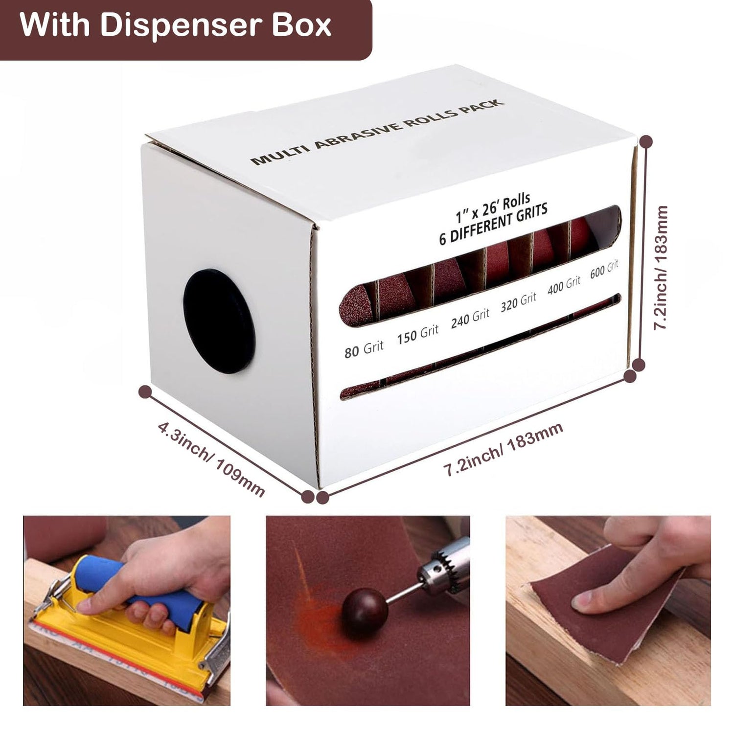 Emery Cloth Roll, 6 Grits 1'' x 26' Sand Paper Roll with Dispenser, 80 150 240 320 400 600 Grit Sandpaper Assortment, Wet Sanding Paper for Metal Automotive Furniture Wood